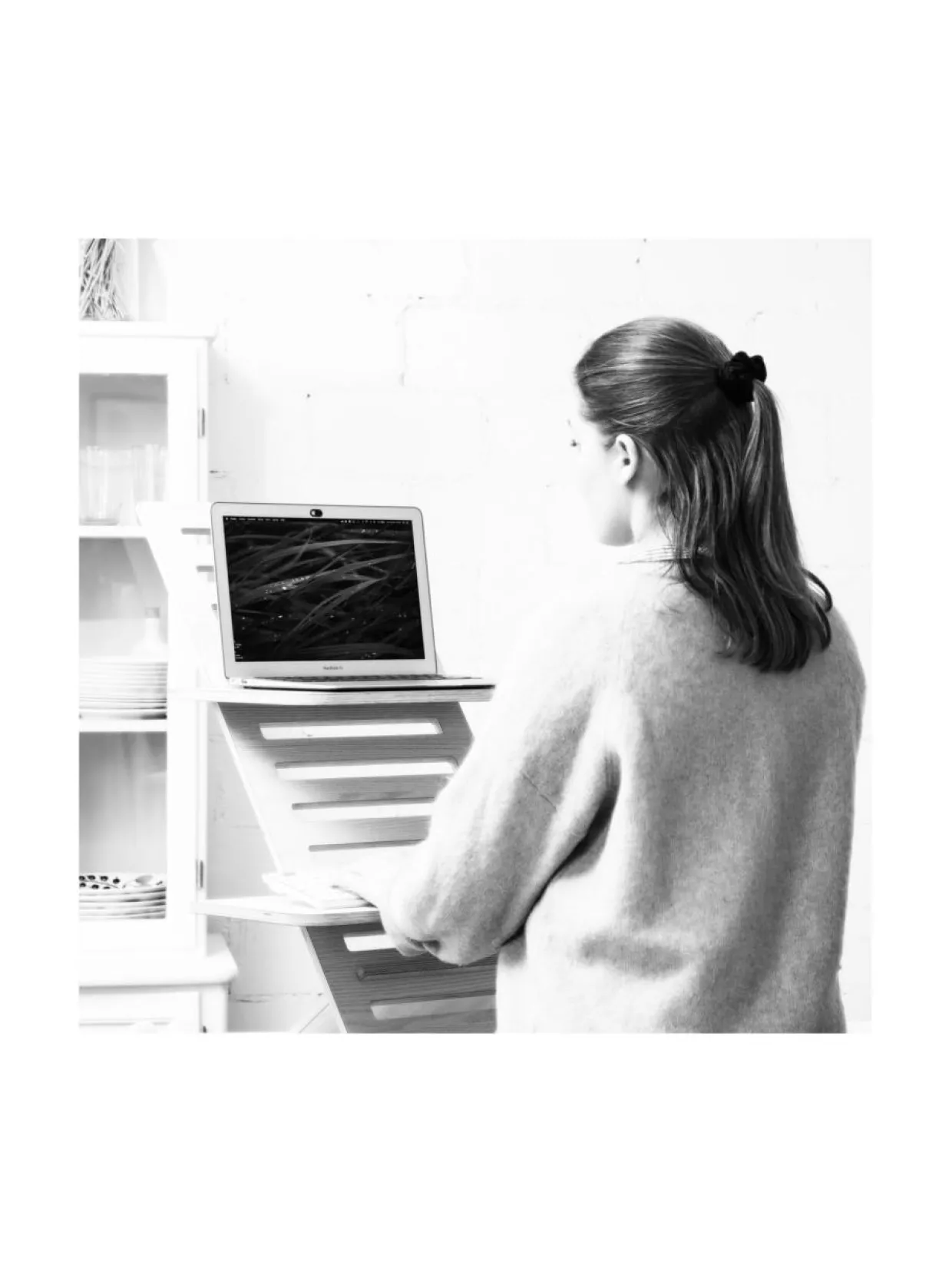 Fiksumpi, ekologisempi ja tehokkaampi tapa työskennellä. Tyylikäs ja ergonominen laptop-teline, valmistettu Suomessa. Säädä korkeutta nopeasti ja helposti; 13 eri korkeuden ansiosta löydät varmasti juuri sinulle sopivan työskentelyasennon! Big Lifterin jalkalevyssä on innovatiivinen patentoitu Puujousi™, joka tekee tuotteen käyttämisestä turvallista ja mukavaa. Neljästä osasta koostuva Hima Big Lifter laptop-teline on helposti kasattava ja siirreltävä. Säädä työskentelykorkeus mieleiseksi nopeasti ja helposti. Yksinkertaisen rakenteen ansiosta tuotteen käyttö on mukavaa sekä tehokasta ja se muuttaa minkä tahansa kiinteän pöydän seisomatasoksi hetkessä! Kantokyky 8 kg/taso. Suomalaista kestävää koivuvaneria, tammilaminaatti