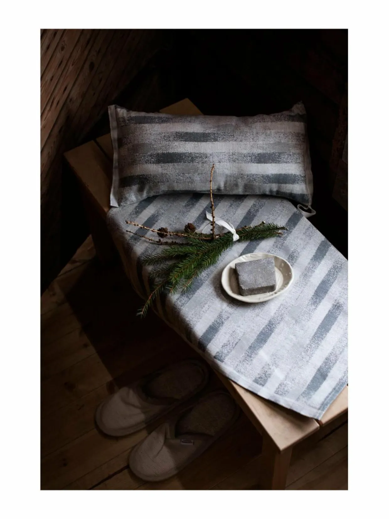 Tuotteet kudotaan brändin omassa kutomossa Lapualla ja niille on myönnetty Avainlippu-tunnus.Materiaali60 % pellava, 40 % puuvilla Hoito-ohjeetPese pellavatekstiilit ennen käyttöä 60°C hienopesuohjelmalla ilman linkousta, erillään muusta pyykistä väljässä vedessä. Myös 40°C riittää. Vältä huuhtelu- ja valkaisuaineita. Ei rumpukuivausta. Kuosittele, mankeloi tai silitä kosteana. Värjäämätön pellava vaalenee pesujen myötä. Kankaan kutistuvuus n. 5%. Älä jätä saunatekstiileitä saunaan saunomisen jälkeen, vaan siirrä aina tekstiilit kuivumaan saunan ulkopuolelle. Pesulämpötila60 °C ValmistusmaaSuomi Väri9 WHITE-GREY AvainsanatLapuan Kankurit, laudeliinat, pellavalaudeliina, kuvioitu laudeliina, saunatarvikkeet
