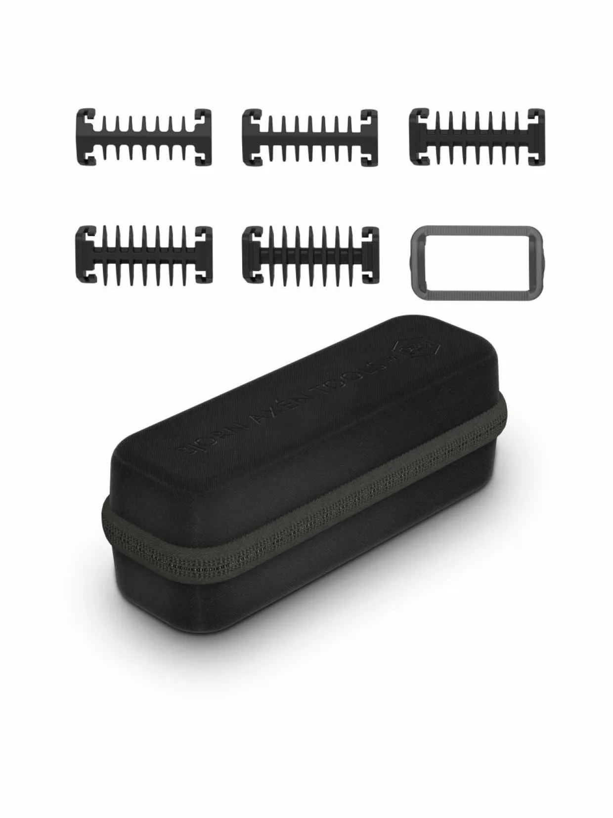Björn Axén Tools Hybrid Pro Trimmer on monitoimitrimmeri, joka sopii käytettäväksi parran trimmaamiseen ja ajamiseen sekä hiusten siistimiseen ja tasoittamiseen. Sen titaanipinnoitetut, ruostumattomasta teräksestä valmistetut kestävät ja itseteroittuvat mustat terät takaavat täydelliset tulokset parranajossa ja trimmaamisessa. Itseteroittuvien terien ansiosta sinun ei tarvitse koskaan vaihtaa teriä, mikä on hyväksi ympäristölle.Wet & Dry -tekniikka Björn Axén Tools Hybrid Pro Trimmer on varustettu Wet & Dry -tekniikalla, minkä ansiosta se sopii käytettäväksi myös suihkussa. Tämä takaa hygieenisen ja monipuolisen käytön.Hybrid Pro Trimmerin mukana toimitetaan viisi erilaista ohjauskampaa, joiden leikkuupituudet ovat 1, 2, 3, 4 ja 5 mm.