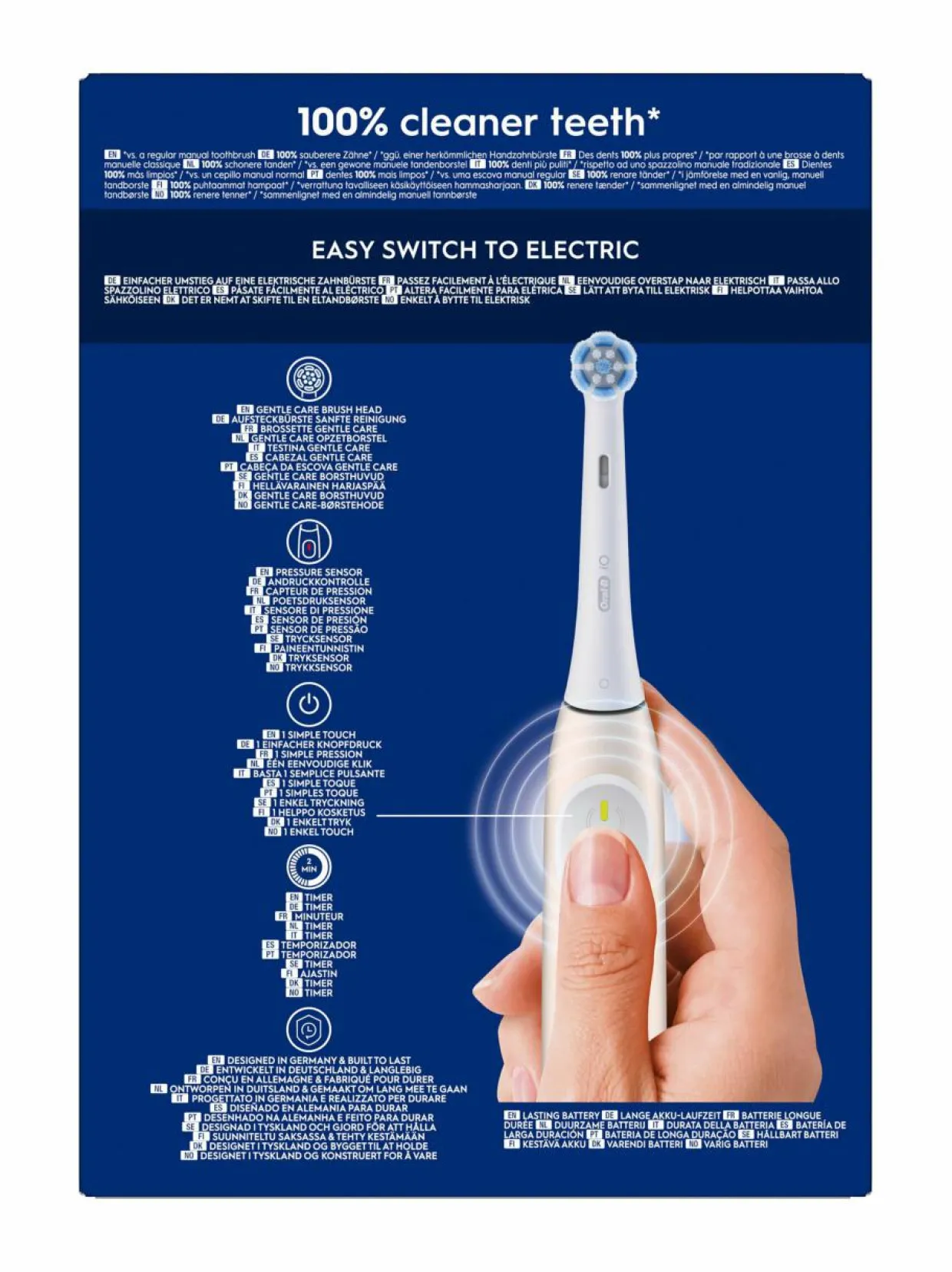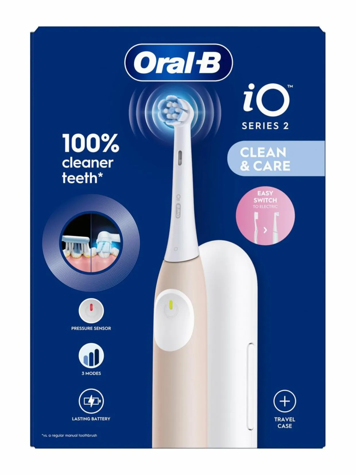 Oral-B:n iO2-sähköhammasharja tarjoaa syväpuhdistuksen 3 voimakkuusasteella, ienpaineanturilla ja 2 minuutin ajastimella, joka tarjoaa 30 sekunnin hälytykset. Sähköhammasharjassa yhdistyvät mikrovärähtelevät harjakset ja hammaslääkärien innoittama pyöreä harjaspää, joiden ansiosta saat ammattimaisen puhtaan tunnun. Mukana tulee matkakotelo. Vaihda Oral-B iO -vaihtoharja 3 kuukauden välein parhaan puhdistustehon säilyttämiseksi.