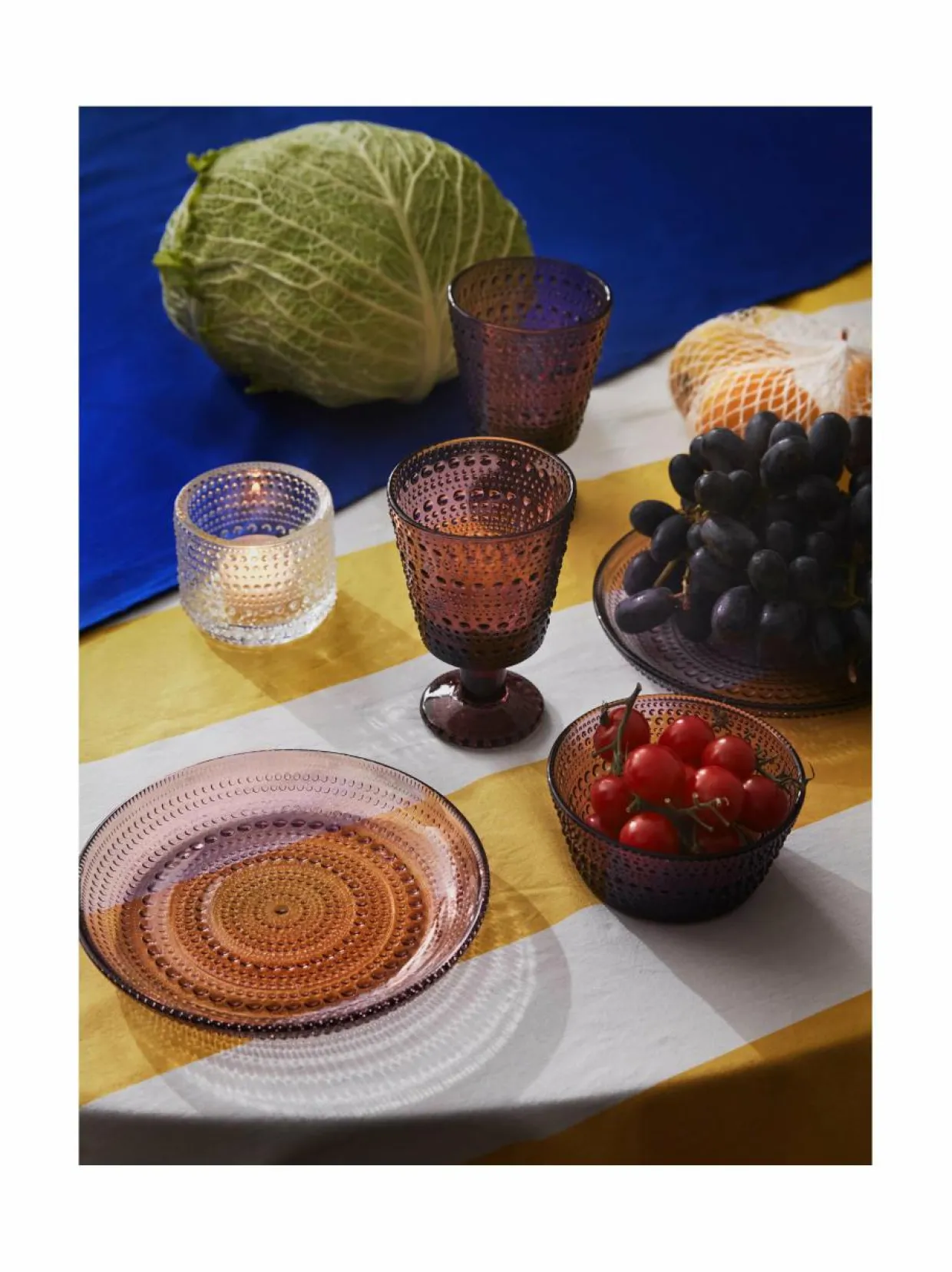 Oiva Toikan suunnittelema Kastehelmi-sarja on saanut innoituksensa aamuauringossa kimmeltävistä kastepisaroista. Pohjoisia metsiä kuvastava luonnollinen kanervan väri on oiva esimerkki Iittalan poikkeuksellisesta väriosaamisesta. Monipuolinen 170 mm:n lasilautanen sopii erinomaisesti jälkiruokien ja pienten herkkujen tarjoiluun ja tuo elegantin lisän kaikkiin kattauksiin.