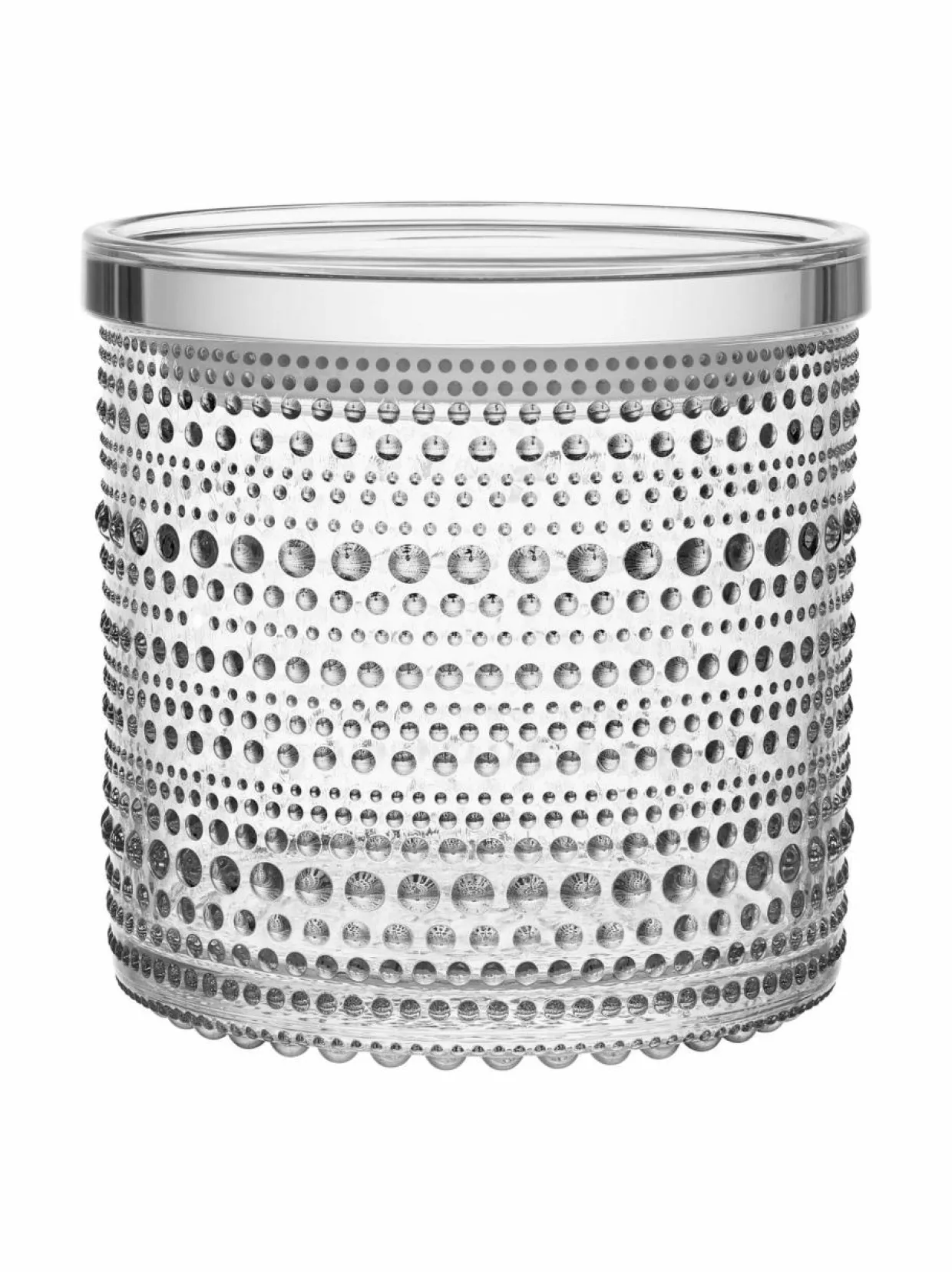 Oiva Toikan suunnittelema helmeilevä, kannellinen purkki on konepesunkestävää lasia. Purkkiin voi säilöä niin ruokaa kuin pieniä esineitäkin. Valmistettu Suomessa.