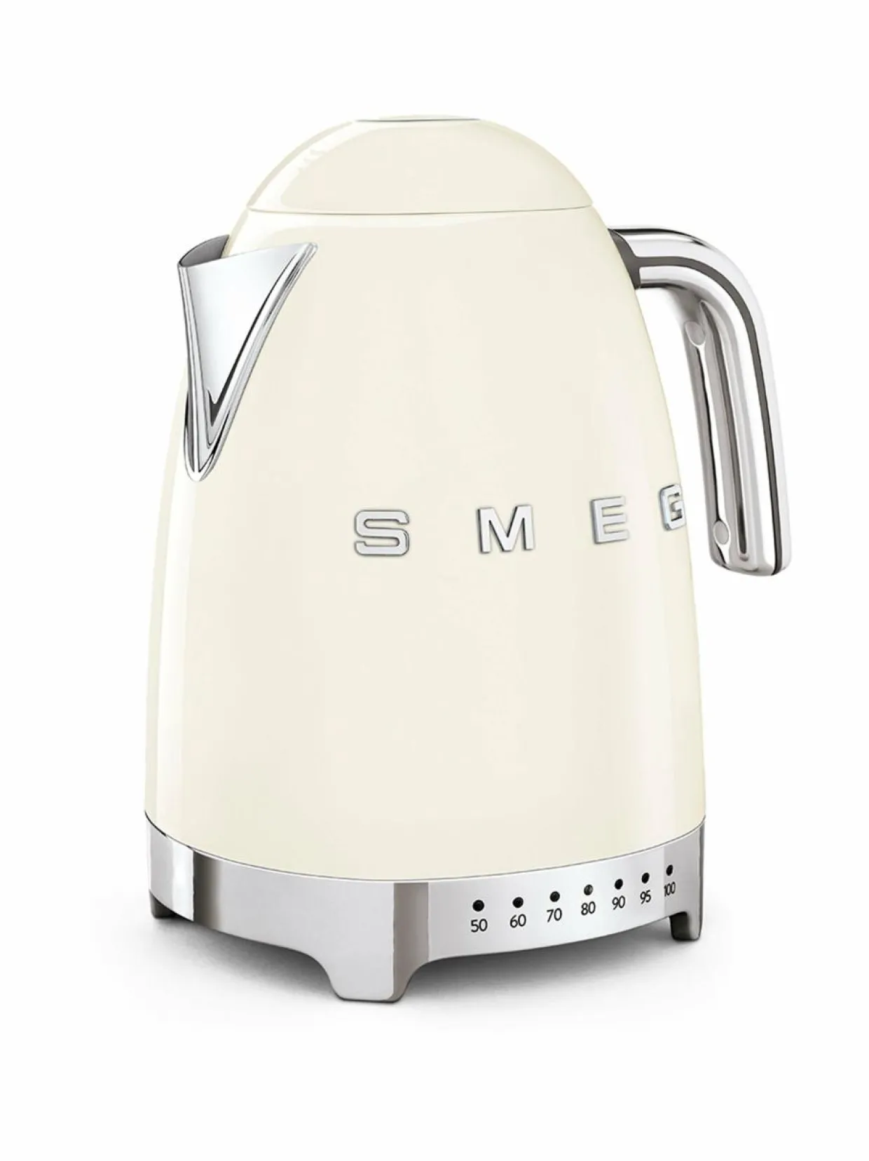Smegin KLF04CREU-vedenkeittimessä on seitsemän eri lämpötila-asetusta 50 °C ja 100 °C välillä, joten voit lämmittää lempiteelaadullesi parhaiten sopivaa vettä. Tehokas 2400 W vedenkeitin kiehauttaa nopeasti jopa 1,7 litraa vettä kerrallaan. Keittimen kannuosa on kermanvalkoiseksi maalattua ruostumatonta terästä.