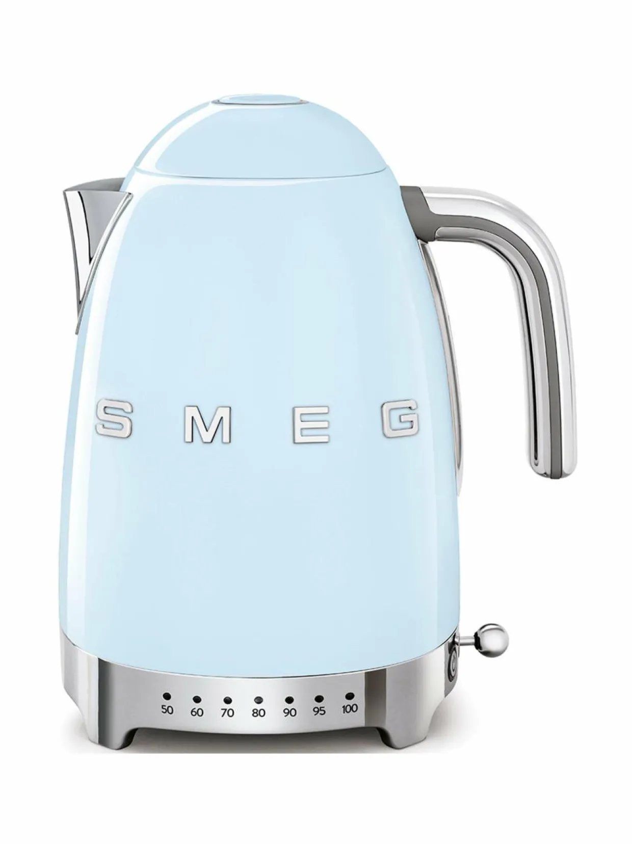 Smegin KLF04PBEU-vedenkeittimessä on seitsemän eri lämpötila-asetusta 50 °C ja 100 °C välillä, joten voit lämmittää lempiteelaadullesi parhaiten sopivaa vettä. Tehokas 2400 W vedenkeitin kiehauttaa nopeasti jopa 1,7 litraa vettä kerrallaan. Keittimen kannuosa on pastellinsiniseksi maalattua ruostumatonta terästä.
