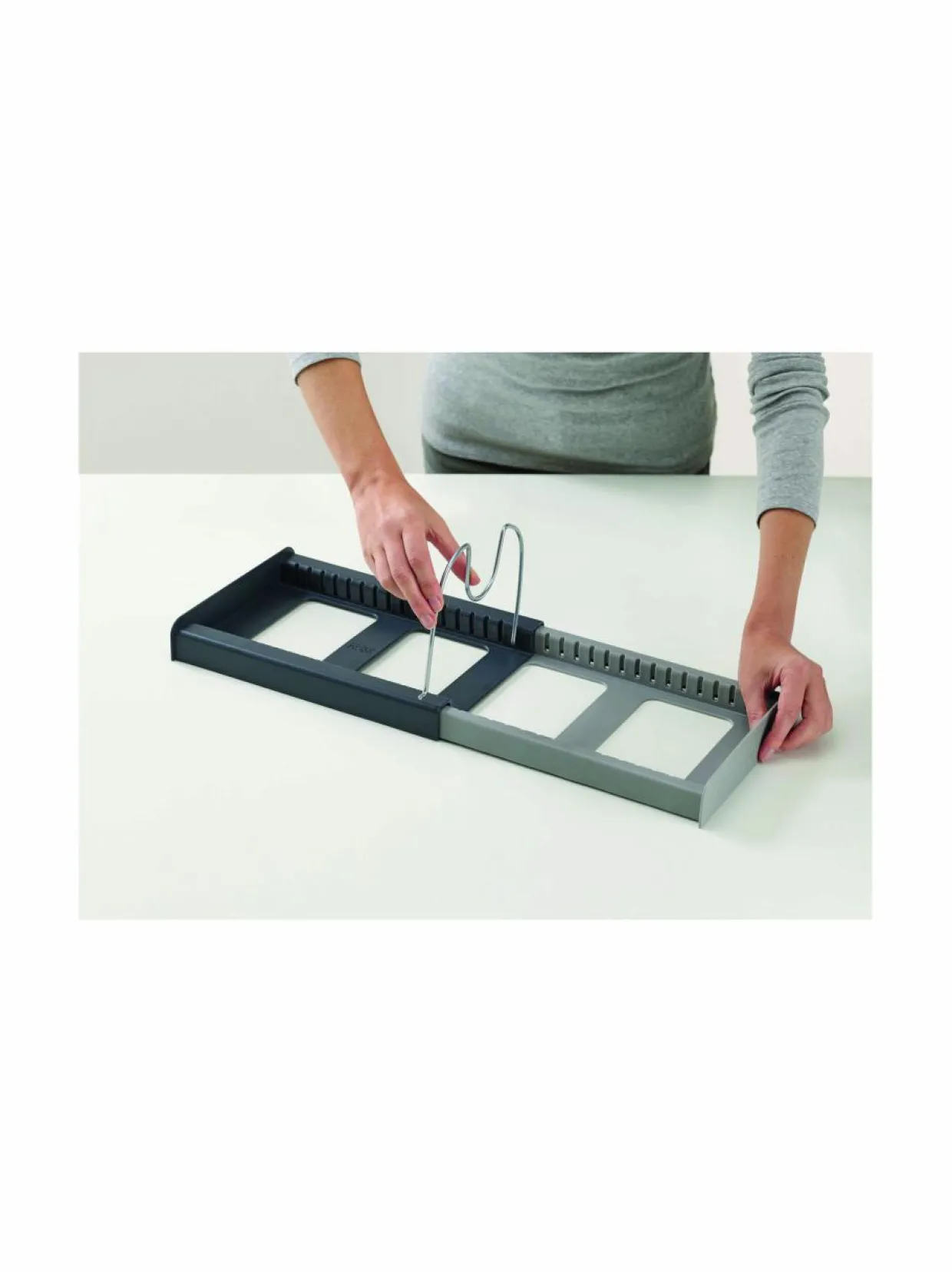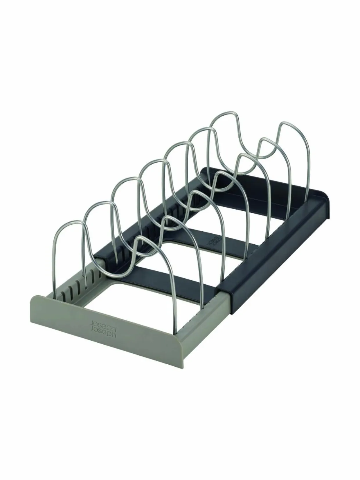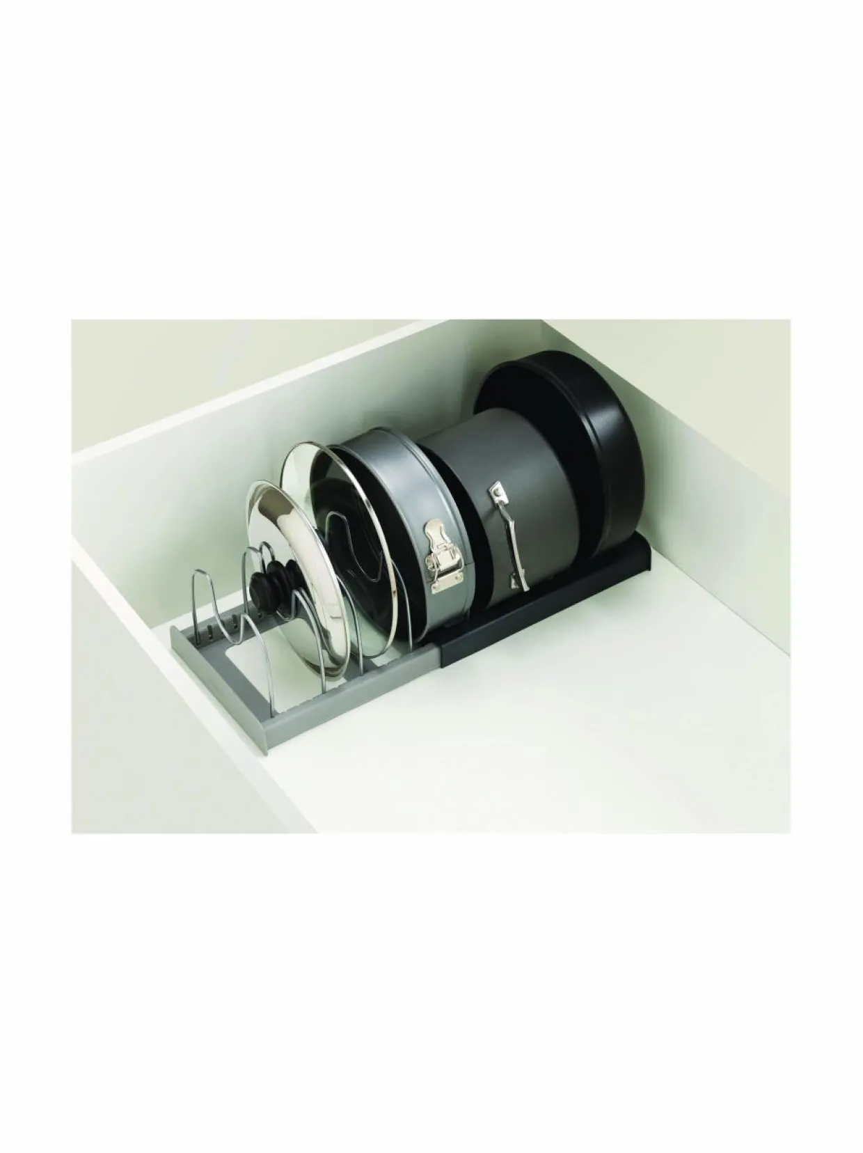 Kokkaustarviketelineellä järjestelet helposti erikokoisia pannuja, kattilan kansia ja kakkuvuokia. Teline on suunniteltu juuri erikokoisten ja -muotoisten tarvikkeiden varastoimiseen. Sen pituutta voi säätää 30,5 sentistä 56 cm asti. Ihanteellinen käytettäväksi kaapin sisällä. Valmistettu muovista, kumista ja ruostumattomasta teräksestä.