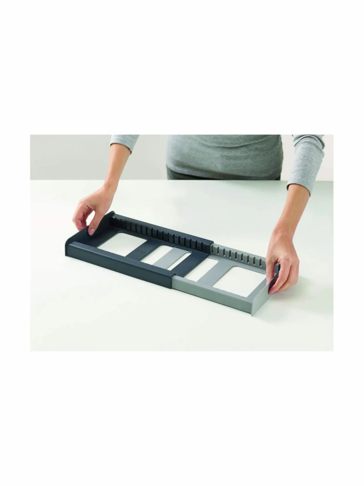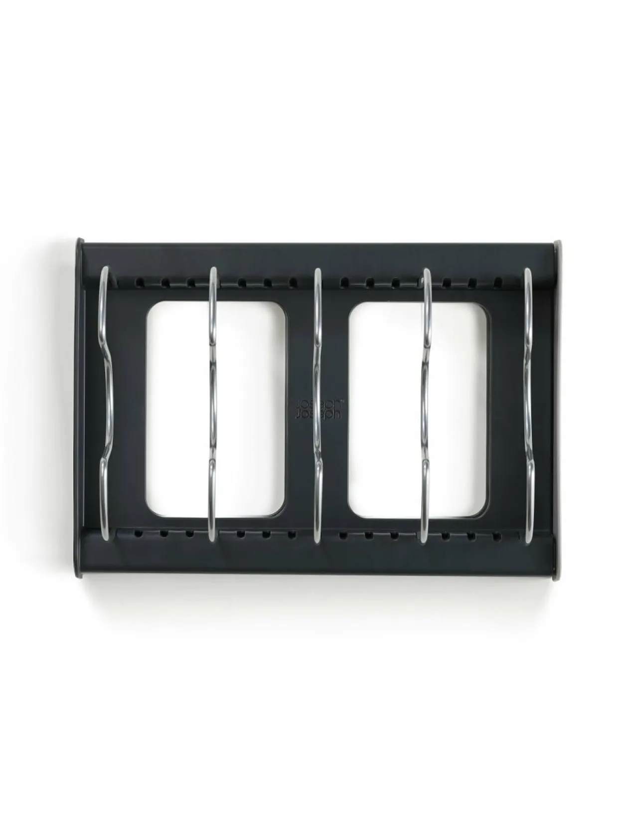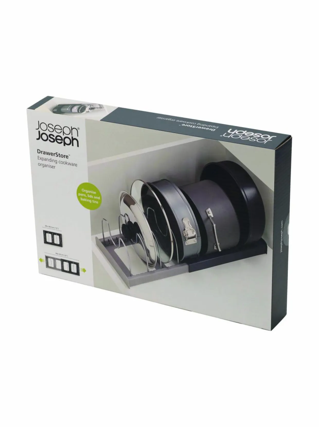 Kokkaustarviketelineellä järjestelet helposti erikokoisia pannuja, kattilan kansia ja kakkuvuokia. Teline on suunniteltu juuri erikokoisten ja -muotoisten tarvikkeiden varastoimiseen. Sen pituutta voi säätää 30,5 sentistä 56 cm asti. Ihanteellinen käytettäväksi kaapin sisällä. Valmistettu muovista, kumista ja ruostumattomasta teräksestä.