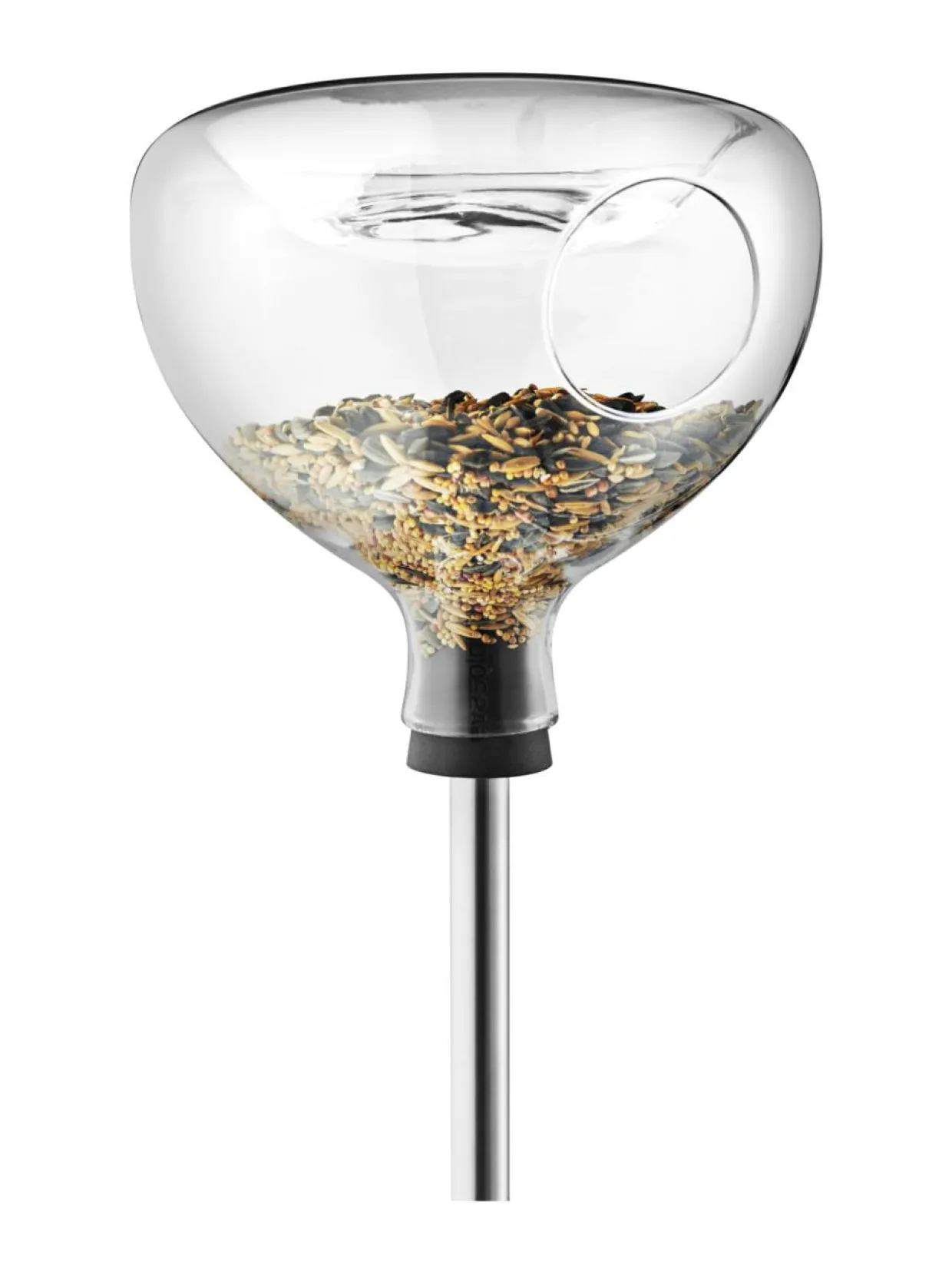 Veistoksellinen lintulauta näyttää tyylikkäältä puutarhassa ja saa pihan pikkulinnut viihtymään. Lasikuvun päällinen on muotoiltu altaaksi, jossa linnut voivat virkistäytyä kylpemällä ja juomalla. Sekä veden että siemenien lisääminen on vaivatonta, ja puhdistus onnistuu astianpesukoneessa. 124 cm korkean lintulaudan lasiseen säiliöön mahtuu n. 0,8 l linnunruokaa.