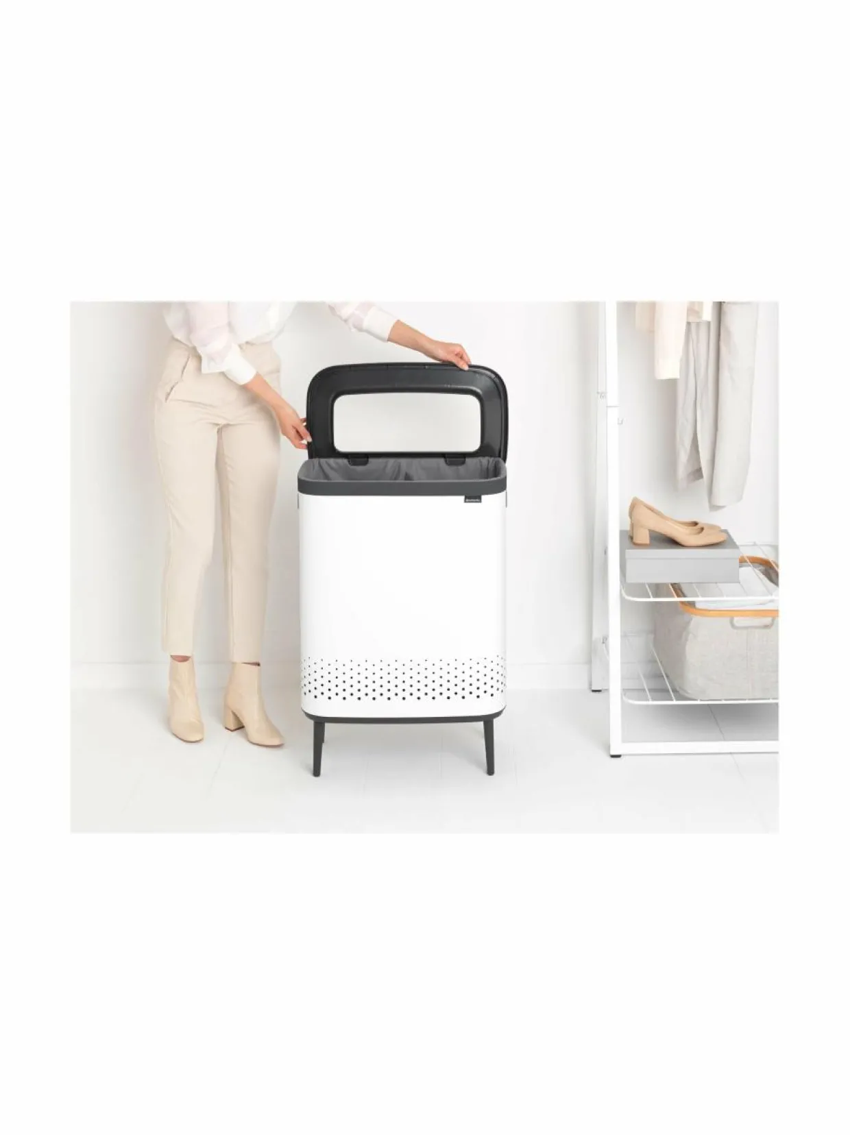 Kauniilla pinnoitteella käsitelty pyykkikori on varustettu irrotettavalla, konepestävällä pyykkipussilla, jonka kaksi lokeroa tekevät pyykin lajittelemisesta vaivatonta. Pyykkikorissa on myös handsfree-kansi, jonka aukosta pyykit voi sujauttaa koriin jopa ilman kannen nostamista.