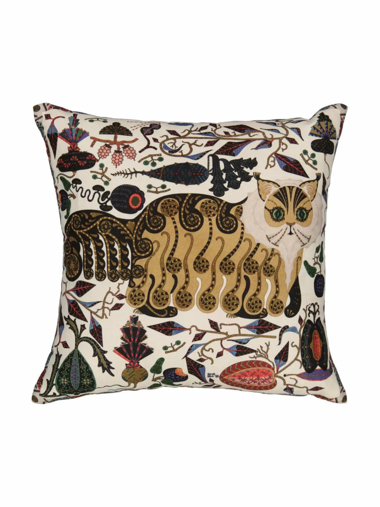 Klaus Haapaniemen sadunomainen kuosi ja tunnelmalliset värit hurmaavat Les Chats Norma -tyynynpäällisessä. Kuosin esikuvana on toiminut Haapaniemen oma kissa Putte ja sen hauskat kissakaverit. Sivussa on piilovetoketju. Materiaali on pellavan ja puuvillan sekoitetta.