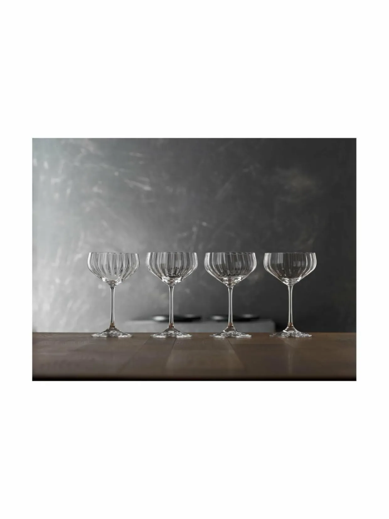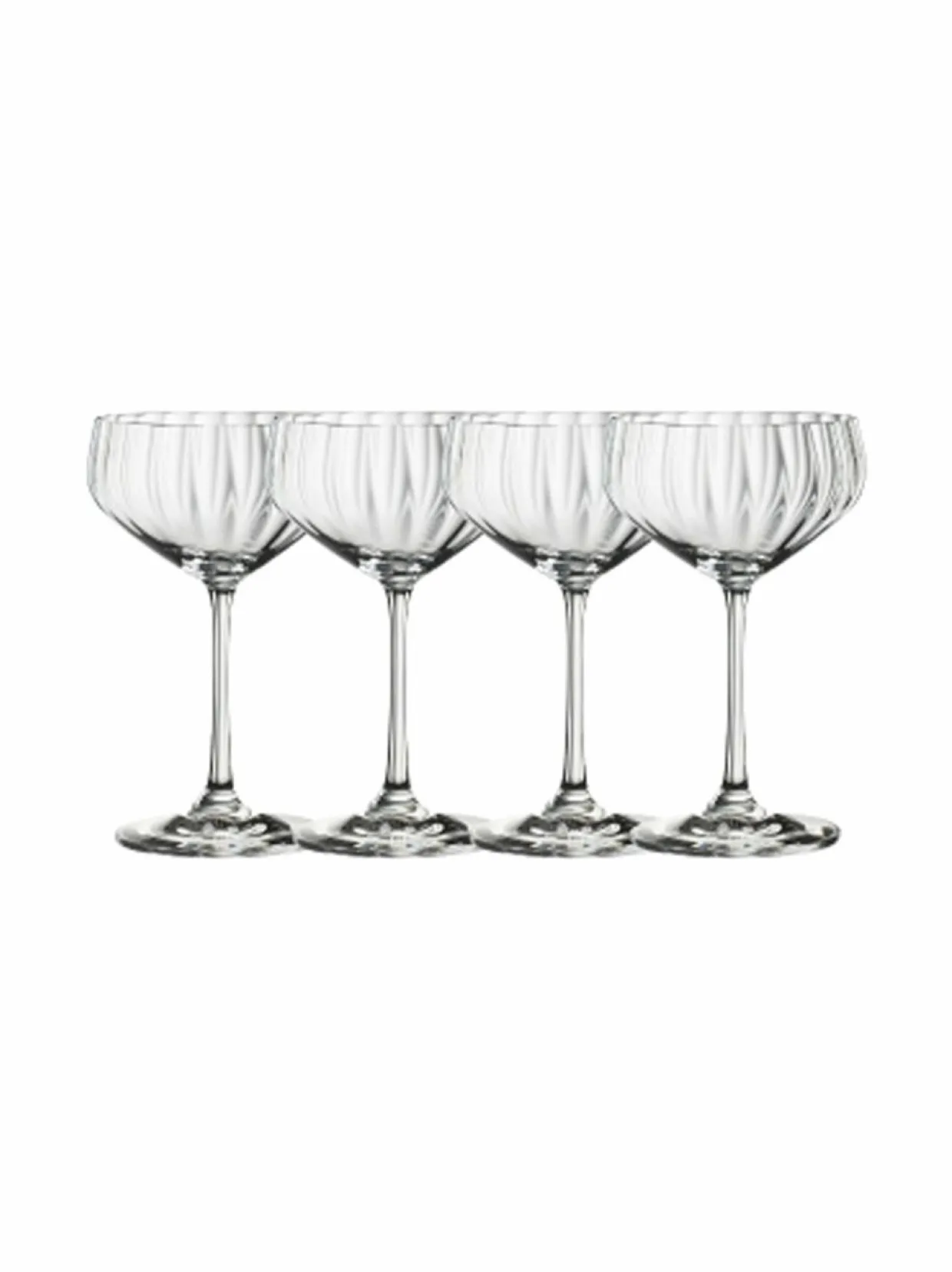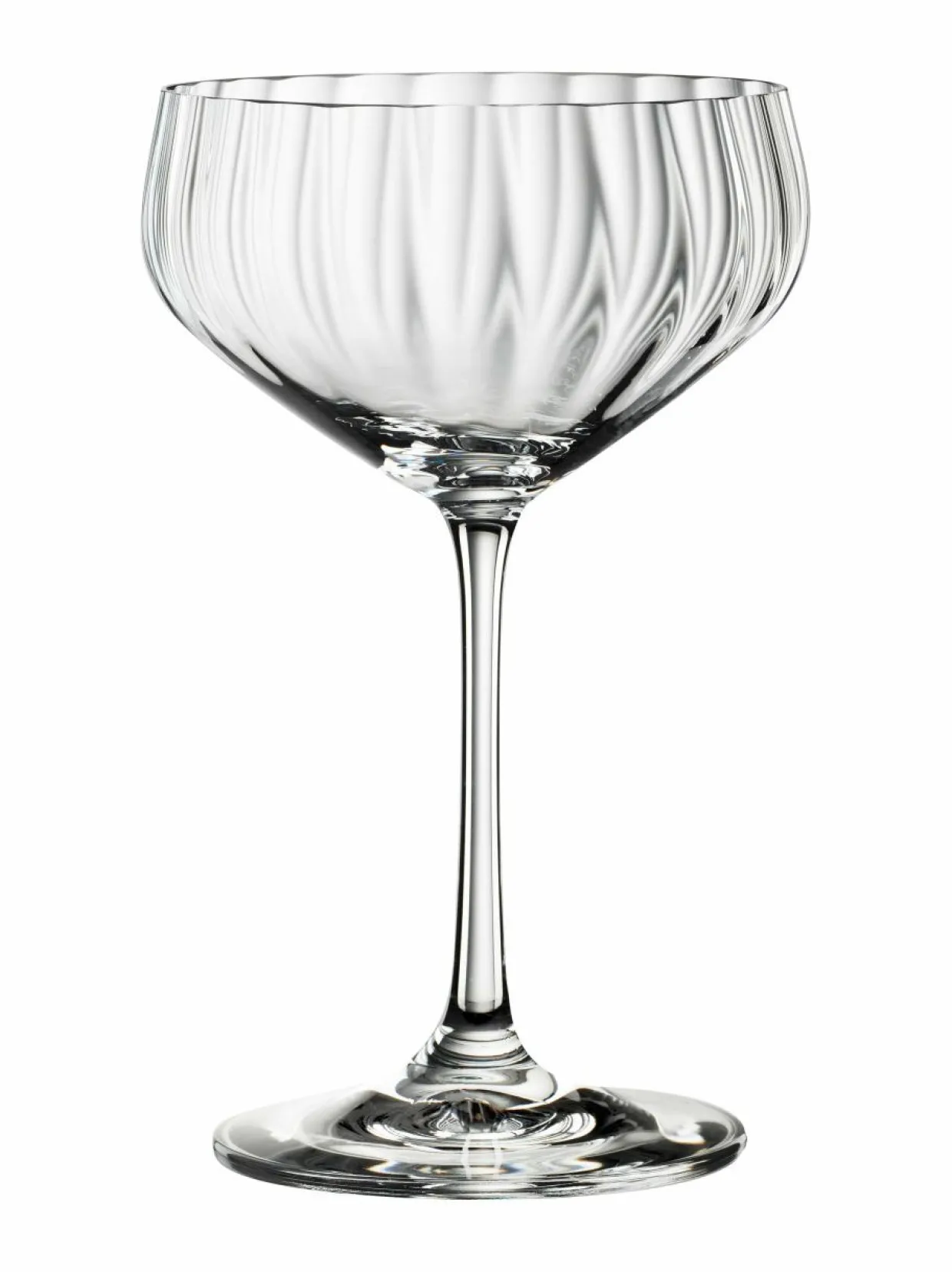 Spiegelau LifeStyle Coupette -lasi on osa Spiegelaun suosittua Lifestyle-lasisarjaa. Sarjan erikoisuus on kaunis aaltomainen muotoilu lasin sisällä. Tämä luo kauniin efektin ja heijastaa valoa upeasti. Lasi on loistava valinta erilaisten lyhyiden cocktailien ja kuohuviinin tarjoiluun. Coupette-nimi juontaa juurensa ranskan sanasta ”coupe”, joka tarkoittaa maljaa tai kulhoa. Lasin korkeus 16,6 cm ja tilavuus 310 ml. Pakkaus sisältää 4 kpl lasia. Kestää konepesun.