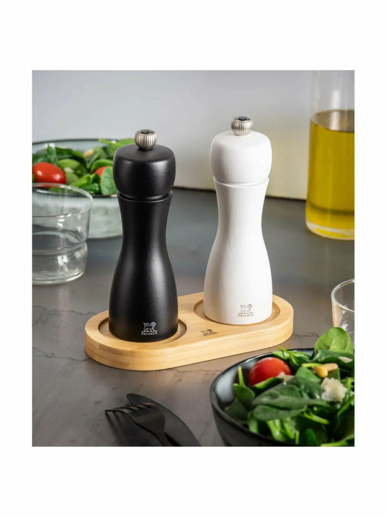 Peugeotin puinen myllyalusta pitää tasot ja pöydän siistinä. Alustan avulla myllyistä varisevat pippuri ja suolat eivät pääse aiheuttamaan sotkua. Puista myllyalustaa on saatavilla vaalean puun värisenä sekä mattamustana.
