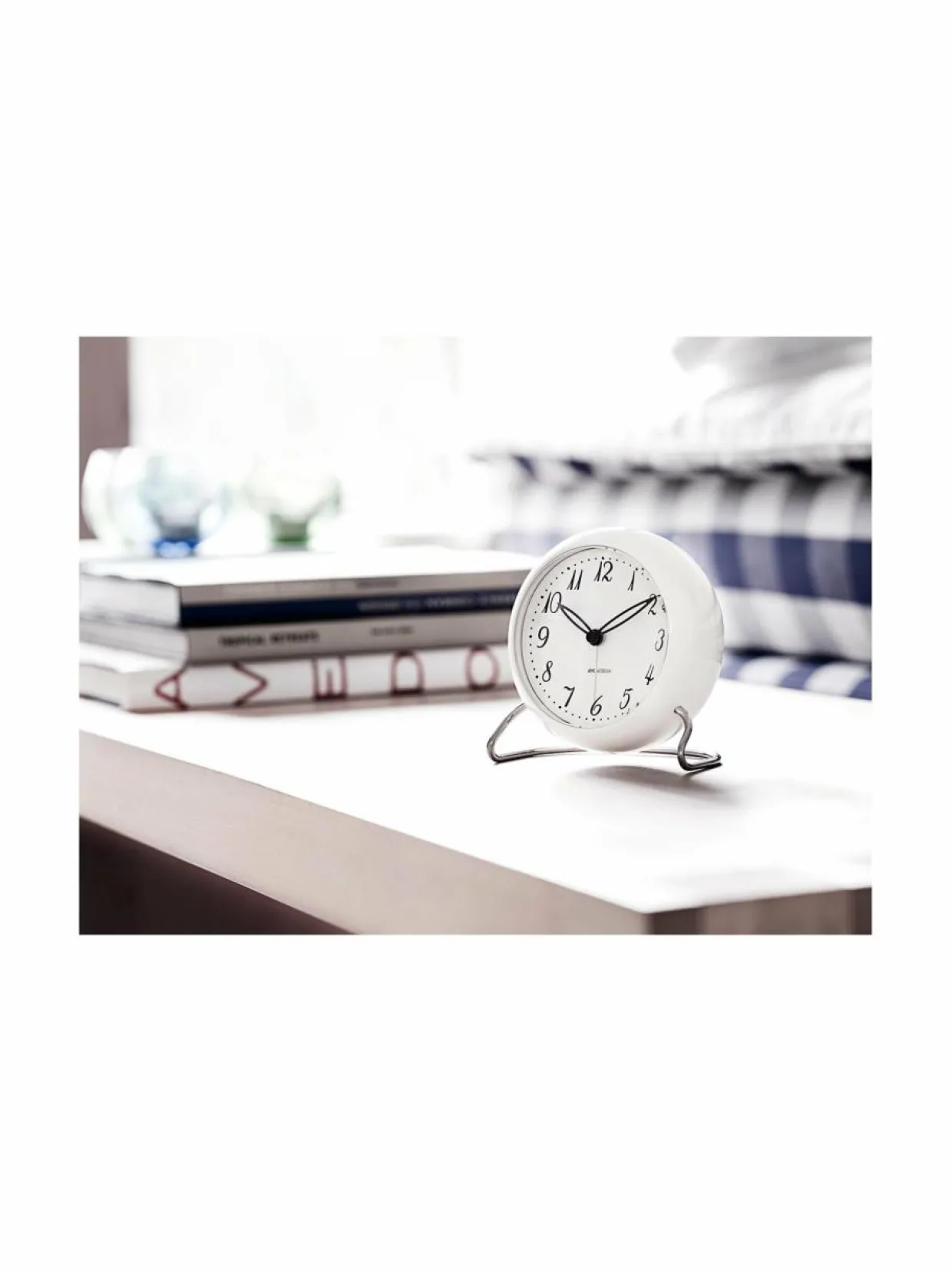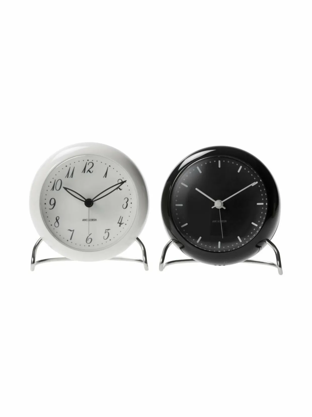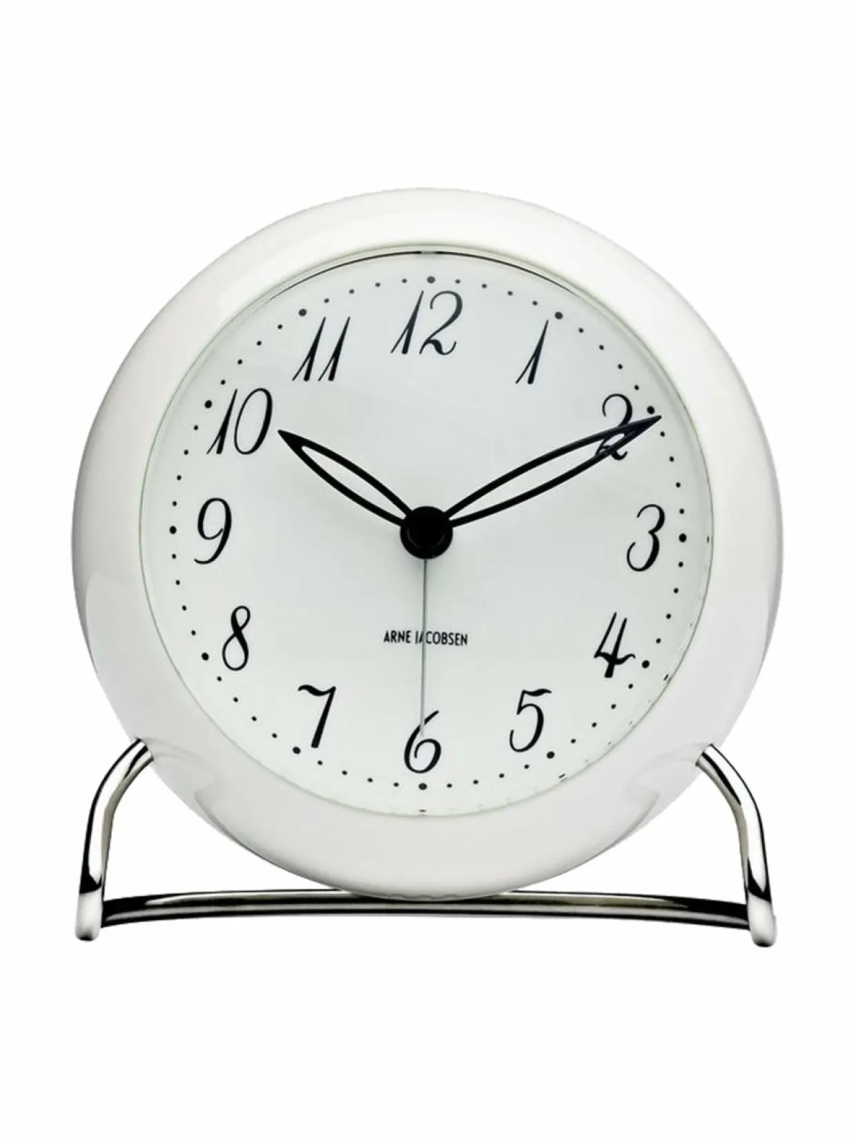 Arkkitehti Arne Jacobsen on suunnitellut paljon kelloja kuulusiin rakennuksiin Tanskassa. Tähän kelloon hän sai innoitteensa Laritz Knudsenin 1930-luvulla teollisuuden mullistaneesta movintaivutustekniikasta. Pöytäkellon graafinen muoto ja metallijalka muistuttavat myös Jacobsenin tunnetuimmista luomuksista,Kello toimii kahdella AA-paristolla. Pakkaus ei sisällä paristoja.