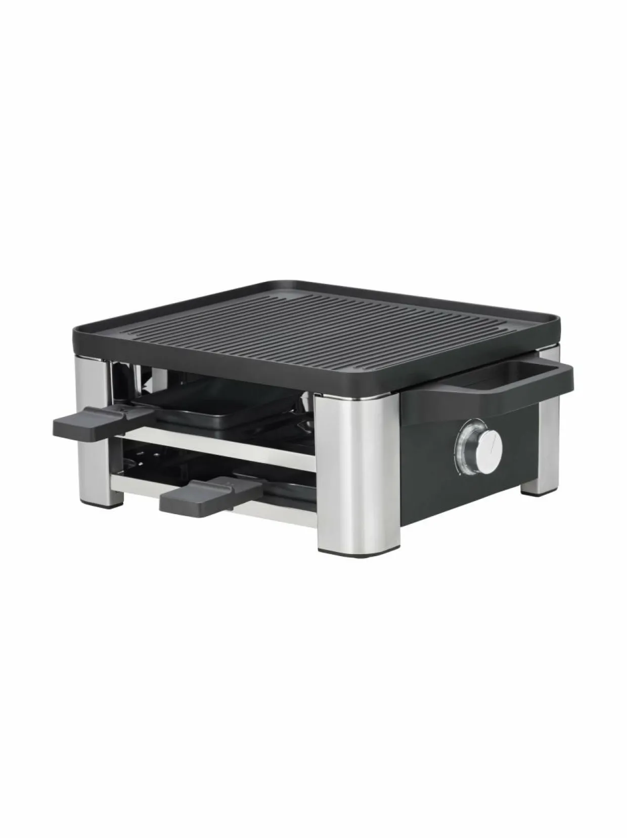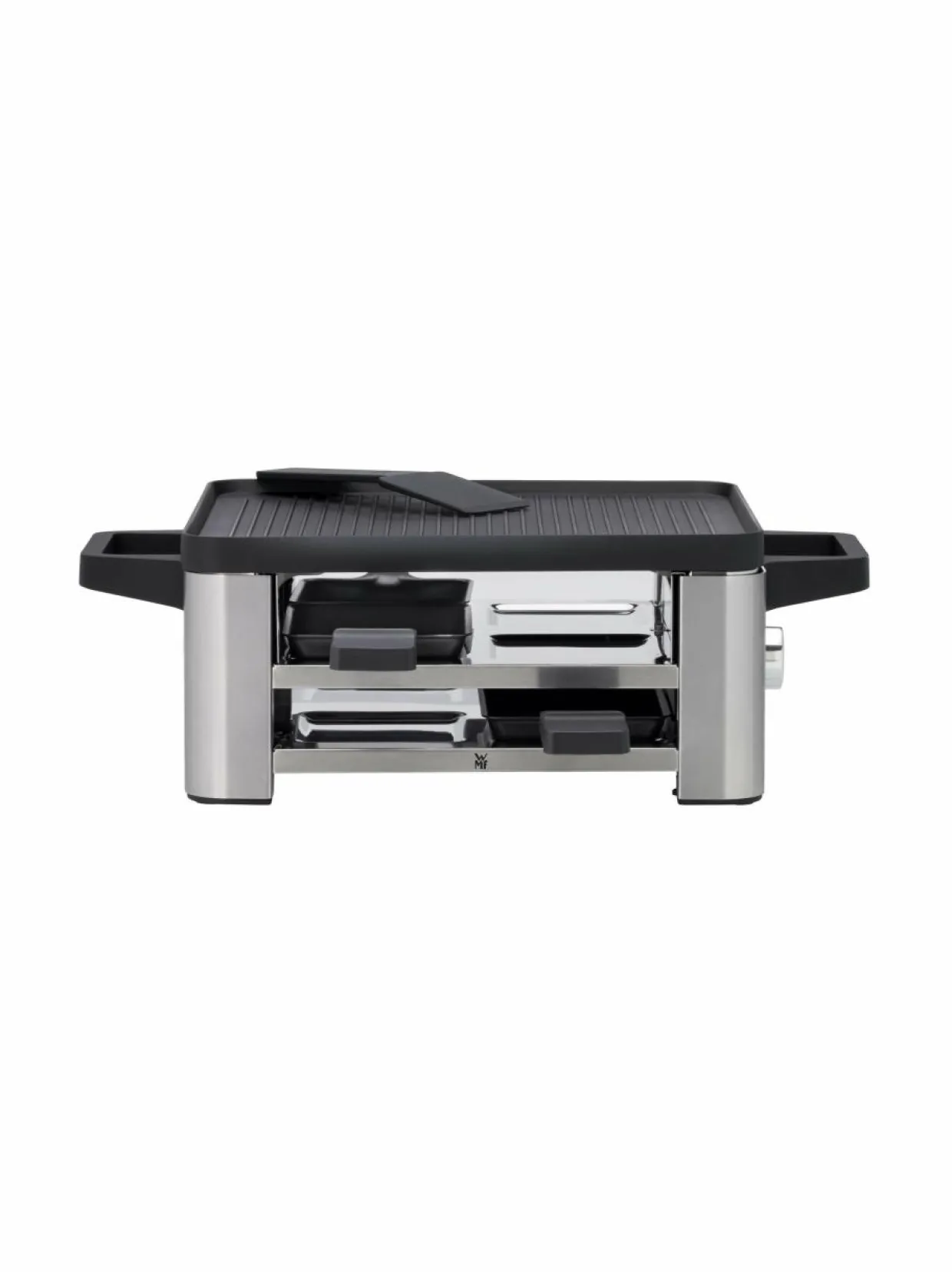 WMF Lono -raclettegrillillä voi valmistaa esimerkiksi lihaa, kalaa ja kasviksia. Neljä laadukasta annospannua ja lastaa takaavat viihtyisän ja yhteisöllisen ruokailuelämyksen. Käännettävässä grillauslevyssä on sekä tasainen että parilaraidat jättävä puoli. Grillissä on käytettyjen, lämpimien annospannujen säilytystila, jonne pannut voi asettaa hetkeksi sivuun. LED-valolla varustettua lämpötilan säädintä on helppo käyttää.