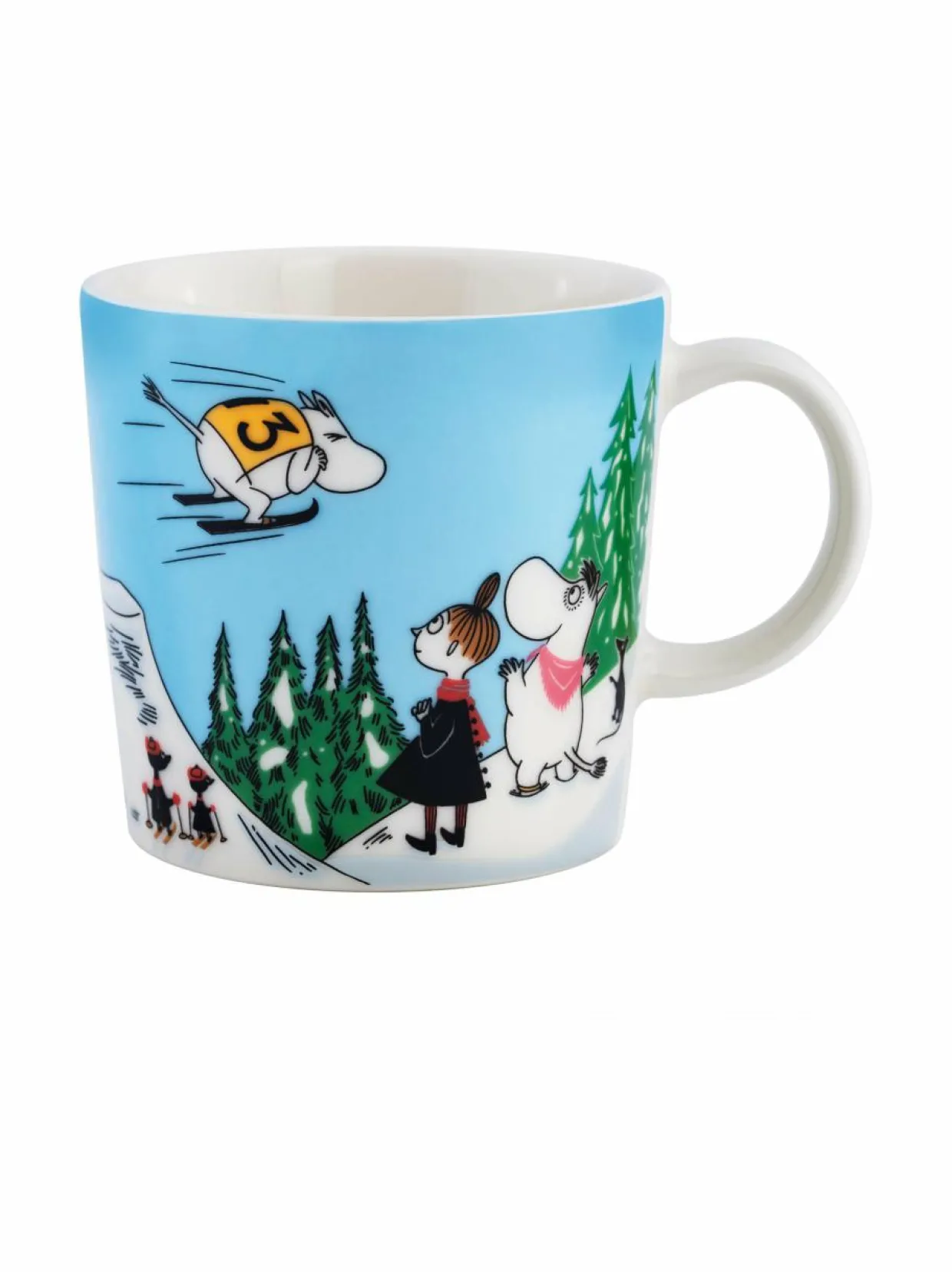 Moomin Arabia Mäkihyppy-muki 0,3 l on valmistettu lasitetusta posliinista. Muki sopii erinomaisesti aamiaiselle tai välipalalle.Muumien seikkailut talviurheilun parissa jatkuvat, kun Muumipeikko päättää osallistua mäkihyppykilpailuun tehdäkseen vaikutuksen Niiskuneitiin. Kun Niiskuneiti ymmärtää lajin vaarallisuuden, hän yrittää estää Muumipeikkoa – mutta liian myöhään. Muumipeikon ilmalento on vaikuttava, mutta se päättyy puiden oksille.