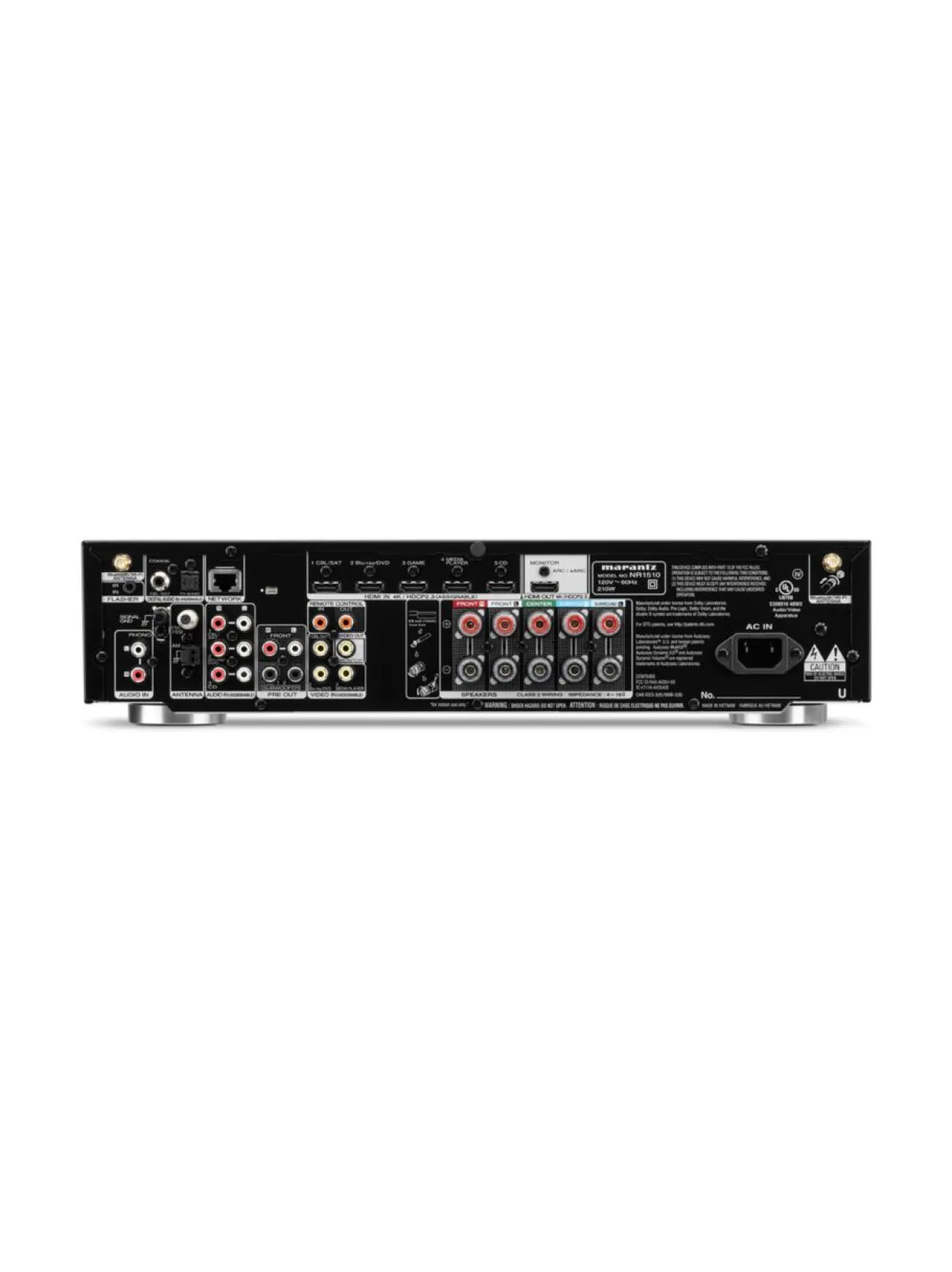 Poikkeuksellisen matalaksi muotoiltu Marantz NR1510 on tehokas 5-kanavainen AV-vastaanotin, joka tuo elämyksellisyyttä elokuvien ja musiikin toistoon. NR1510 sisältää viisi 50 wattista vahvistinta (8 ohmia, 20Hz-20kHz, 0,08% THD, 2 kanavan kuormituksella), kuusi moderneja kuvaformaatteja tukevaa HDMI-sisääntuloa. eARC-liitäntä televisiolle sekä toistomahdollisuudet analogisista ja digitaalisista liitännöistä. Sisäänrakennettu WiFi ja Bluetooth-yhteys mahdollistavat langattoman musiikin striimaamisen kaikista suosituista verkkopalveluista. Levysoitin yhdistyy vahvistimen phono-liitäntään vinyylikokoelmasta nauttimista varten. Vastaanottimen operointi käy kätevästi Marantz AVR Remote -applikaation ja ääniohjauksen avulla. Merkittävimpiä ääniassistentteja tukeva NR1510 on kontrolloitavissa puheella Amazon Alexan, Google Assistantin tai Apple Sirin avulla. Helppoa käyttöönottoa tukee Audyssey MultEQ -huonekorjaustyökalu, joka optimoi ääniasetukset tilaan ja kaiuttimille sopiviksi.