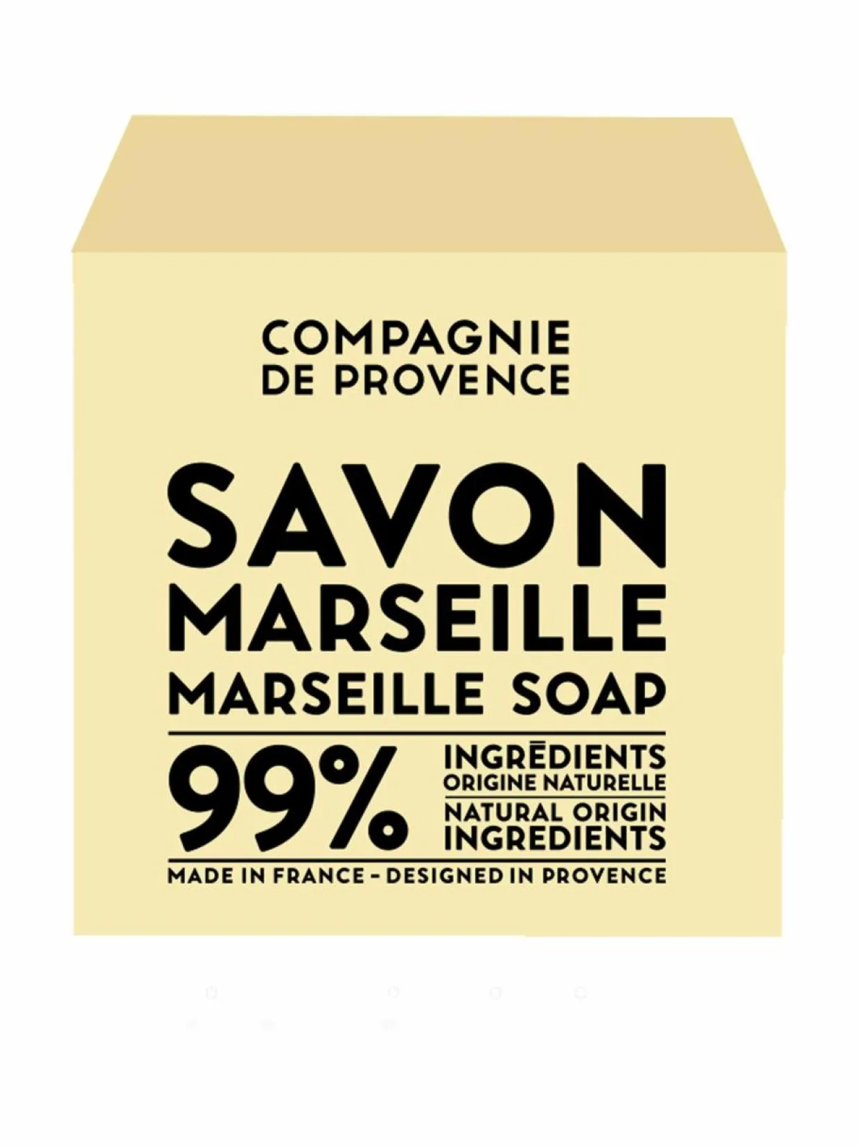 Compagnie De Provencen Marseille-palasaippua valmistetaan Marseillessa perinteitä kunnioittaen. Ympäristöystävällinen saippua ei sisällä palmuöljyä eikä hajusteita. Hellävarainen palasaippua sopii päivittäiseen käsienpesuun, suihkusaippuaksi sekä hellävaraiseen pyykinpesuun.