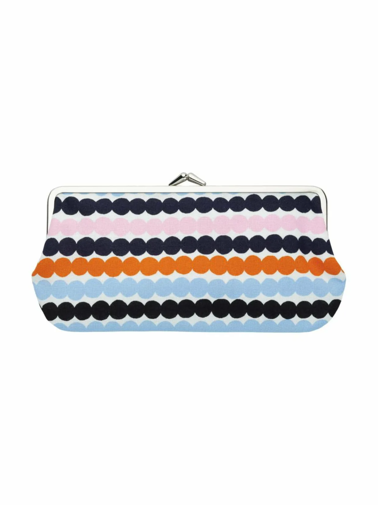 Marimekon puuvillasta valmistettu silmälasikukkaro on monikäyttöinen klassikko, joka toimii myös oivana penaalina. Kukkarossa on metallinen kehys, joka on helppo napsauttaa auki ja kiinni. Kukkaron Mini Räsymatto -kuosi on painettu Helsingissä.