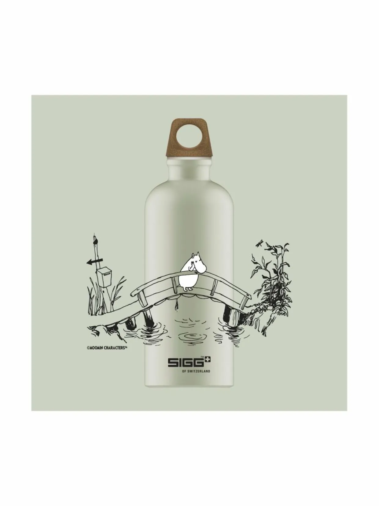 SIGG x Moomin Novels kaunis mallisto on saanut inspiraationsa kirjasta Muumipeikko ja Pyrstötähti (1946). Tässä kauniissa pullossa on klassinen kuvitus Muumipeikosta sillalla.