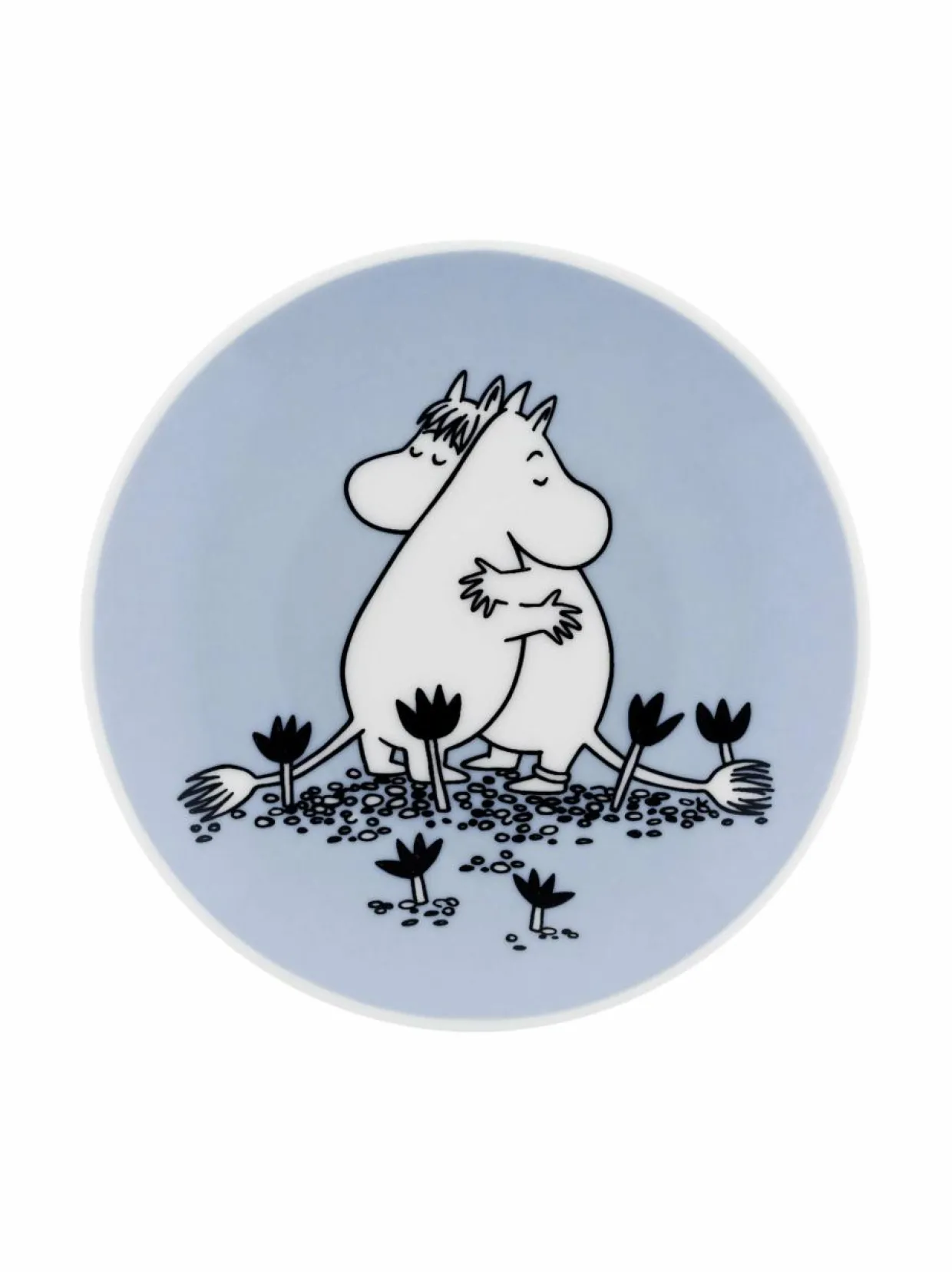 Arabian valmistama ihastuttava keräilylautanen kuuluu erikoispainokseen, jossa on Moomin 80 -leima. Lautasen kuvassa Muumipeikko ja Niiskuneiti halaavat toisiaan kukkakedolla.