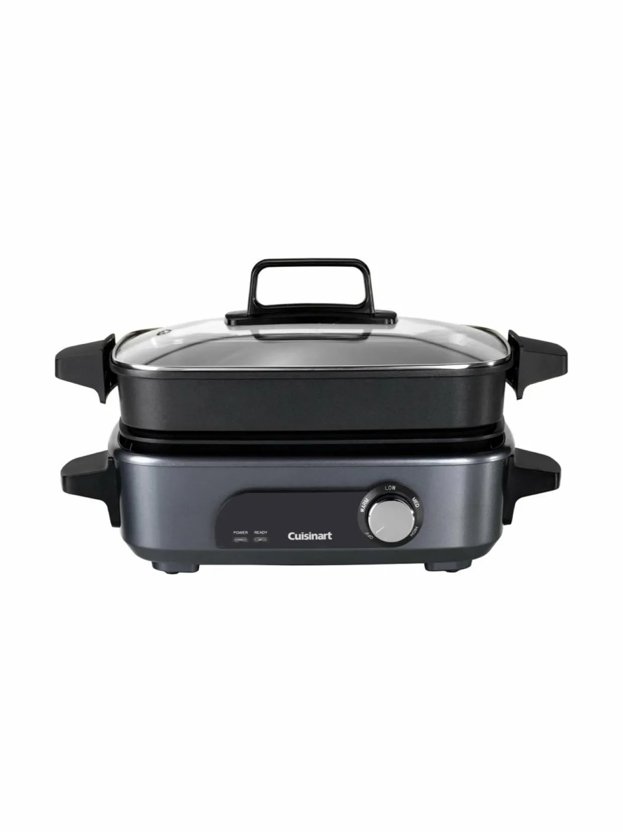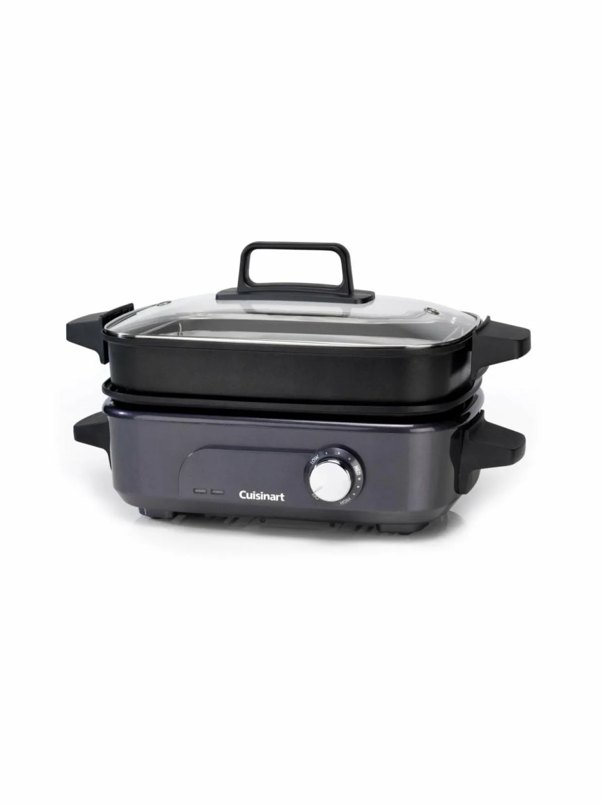 Cuisinart Multi Cooker -monitoimikeittimen avulla voit valmistaa suosikkiruokasi grillaten, paistaen, höyryttäen, kiehauttaen sekä keittäen. Säädettävän lämpötilan myötä voit grillata täydellä teholla sekä antaa ruoan hautua matalalla lämmöllä. Sopivan lämpötilan voit valita asteikolla 90 – 220 °C yksinkertaisen säätimen avulla. Monitoimikeittimen mukana toimitetaan myös höyrytysastia, grillilevy sekä syvä keittoastia lasikannella. Höyrytysastia sopii esimerkiksi vihannesten ja dumplings-nyyttien valmistukseen. Grillilevyllä kala, hampurilaiset ja vartaat saavat hienon paistopinnan herkkupöytään. Syvä keittoastia sopii pasta-annosten ja pataruokien rauhalliseen haudutukseen, lasikannen avulla suojaat keittiötä roiskeilta.