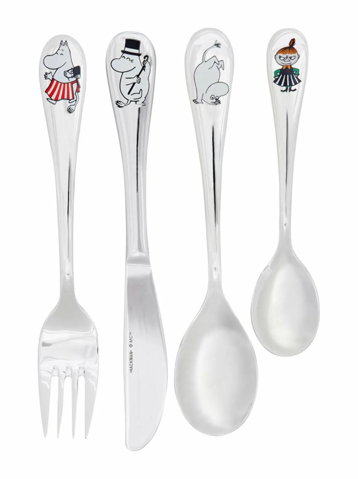 Muumien seurassa herkutteluhetkestä tulee seikkailu. Muumi-aterimien muotoilussa on otettu huomioon erityisesti pienet käyttäjät, mutta ne sopivat hyvin myös isompiin käsiin. Settiin kuuluu suosikkihahmojen kuvilla varustetut haarukka, veitsi, lusikka ja pikkulusikka. Ruostumattomasta teräksestä valmistetut aterimet ovat konepesunkestäviä.