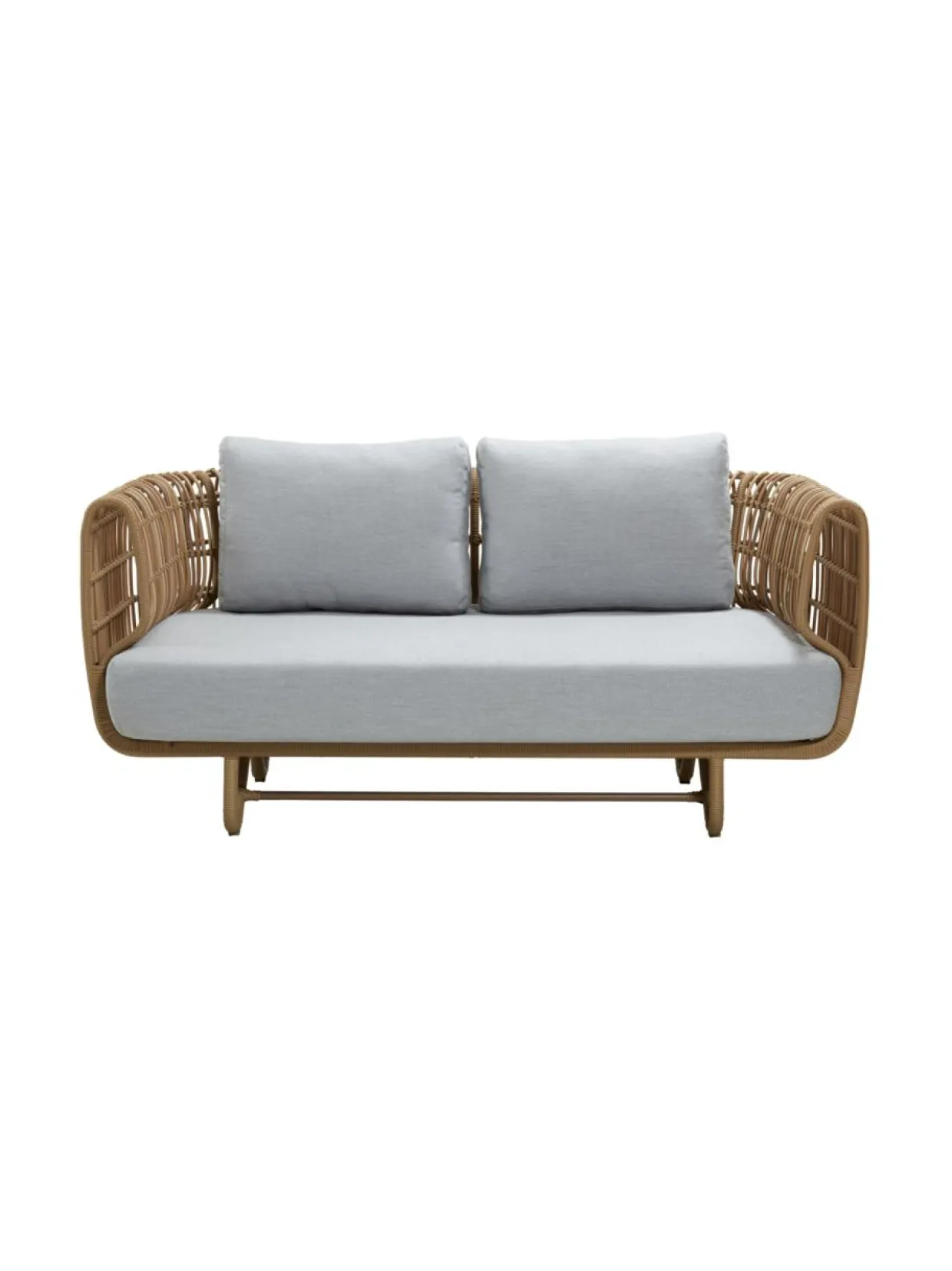 Nest-sohva ulkokäyttöön. 162 cm lev, 84 syv, 79 kork, 40 istuinkork. Istuintyyny sisältyy hintaan, vaaleanharmaa Cane-Line Natté. Luonnonvärinen Cane-line Weave® -punosmateriaali, alumiinirunko.