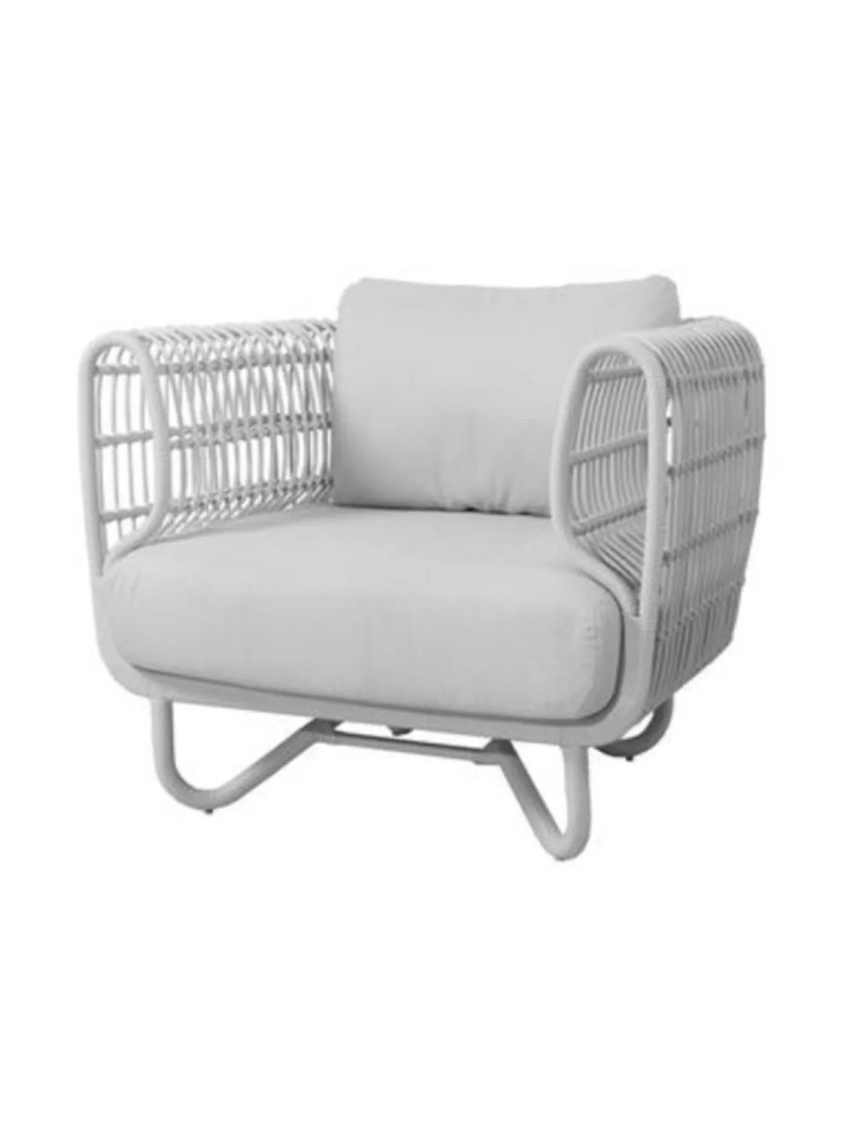 Ajaton ja kestävä Nest-nojatuoli ulkokäyttöön. 90 cm lev, 80 cm syv, 74 cm kork, 40 cm istuinkork. Valkoinen Cane-line Natté tyynysetti sisältyy hintaan. Valkoinen Cane-line Weave-punos ja alumiinirunko.