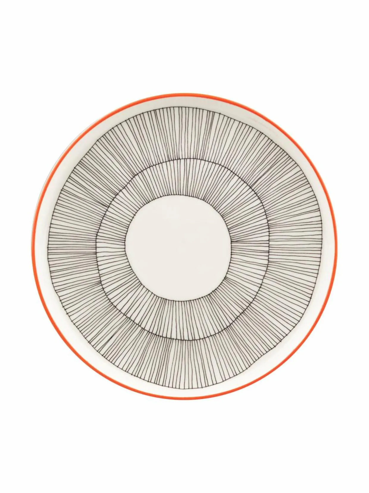 Marimekon Oiva-lautanen on koristeltu graafisella Kukat puhkeavat -kuosilla, jossa on käsinmaalattu oranssi reuna. Lautanen on valmistettu kestävästä keramiikasta ja sen halkaisija on 20 cm.