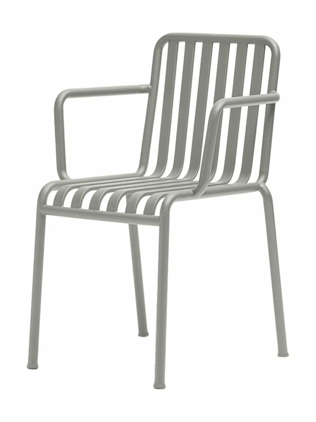Hayn käsinojallinen Palissade-tuoli kuuluu Ronan ja Erwan Bouroullecin käsialaa olevaan kalustemallistoon, joka on suunniteltu erityisesti ulkokäyttöön. Kestävät ja ajattoman kauniit teräskalusteet sopivat niin julkisiin kuin yksityisiin tiloihin, ja ne näyttävät luontevilta puutarhojen, terassien ja parvekkeiden lisäksi myös kahviloissa ja ravintoloissa. Harkitun muotokielensä ansiosta kalusteet ovat tukevia olematta kömpelöitä ja elegantteja olematta heppoisia. Erilaisten tuolien lisäksi mallistoon kuuluu pöytiä, penkkejä ja sohvia sekä kalusteisiin sopivia pehmusteita.