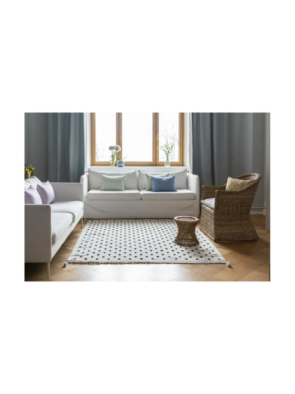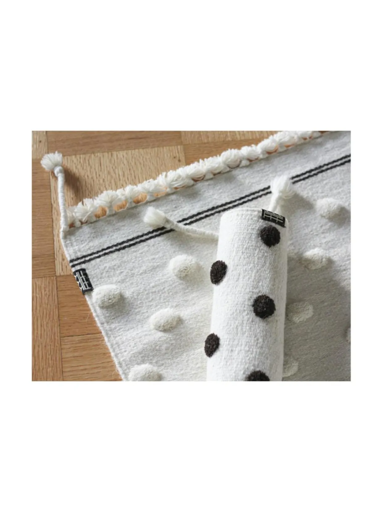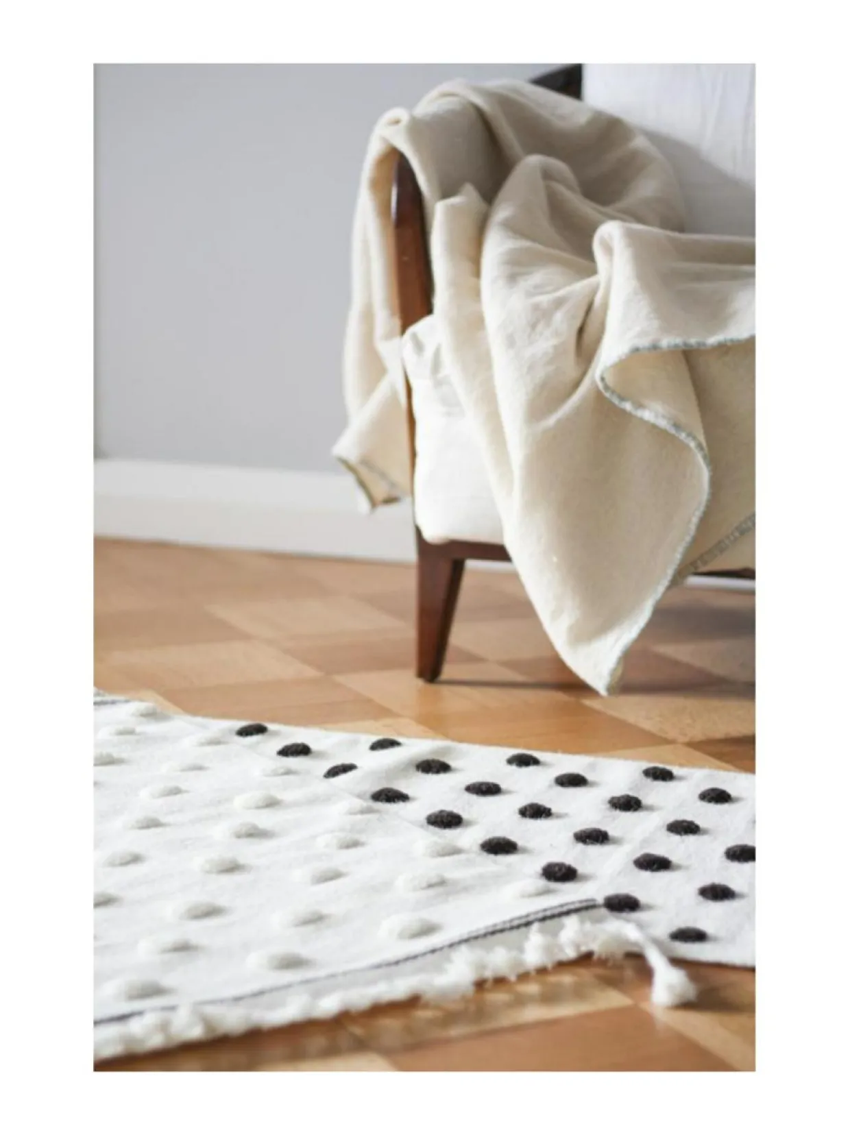 Käsinkudottu pilkullinen villamatto, jonka kolmiulotteiset pilkut on tehty ryijytekniikalla. Mustat pilkut ovat värjäämätöntä mustan lampaan villaa. Jokaisesta matosta löytyy kutojansa nimikirjain, joka kertoo tuotteen alkuperän. Villamatot kudotaan käsin Pohjois-Gujaratin maaseutukylien kodeissa, joissa kudonnan perinteet ovat usein säilyneet sukupolvilta toisille. Tuotantoa ja suunnittelua ohjaavat reilun kaupan periaatteet. Tuotteen kautta tuet käsityöläisten työllistymistä suoraan kotikylissään ja paikallista kestävää kehitystä. Matoissa käytetty paikallinen intialainen villa on kemikaalivapaata ja mattoa suojaava lanoliini (villan rasva) on vielä tallella – matot sopivat loistavasti myös haastavampiin paikkoihin kuten keittiöön ja eteiseen.