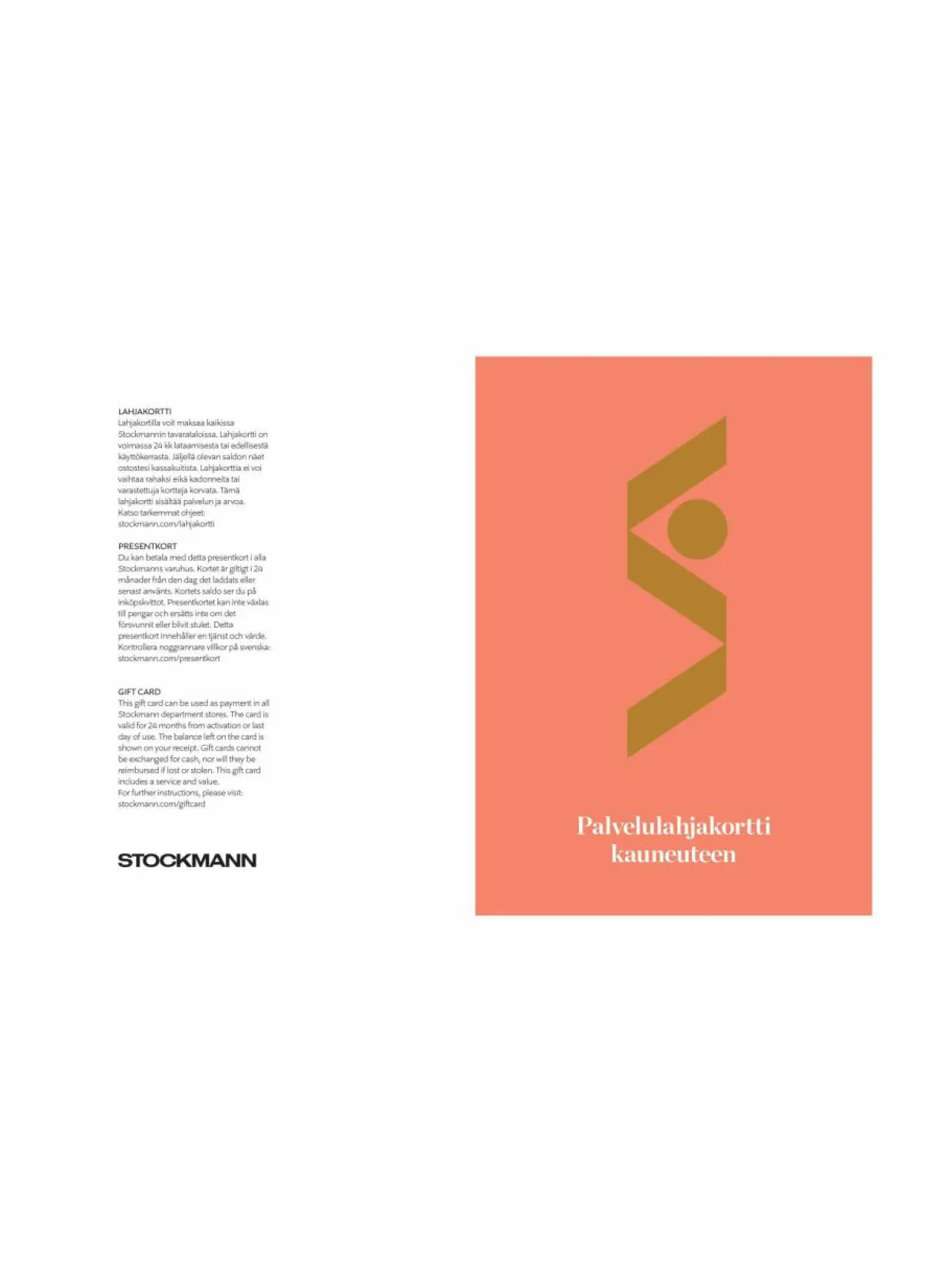 - Palvelulahjakortti ei käy maksuvälineenä stockmann.com -verkkokaupassa.