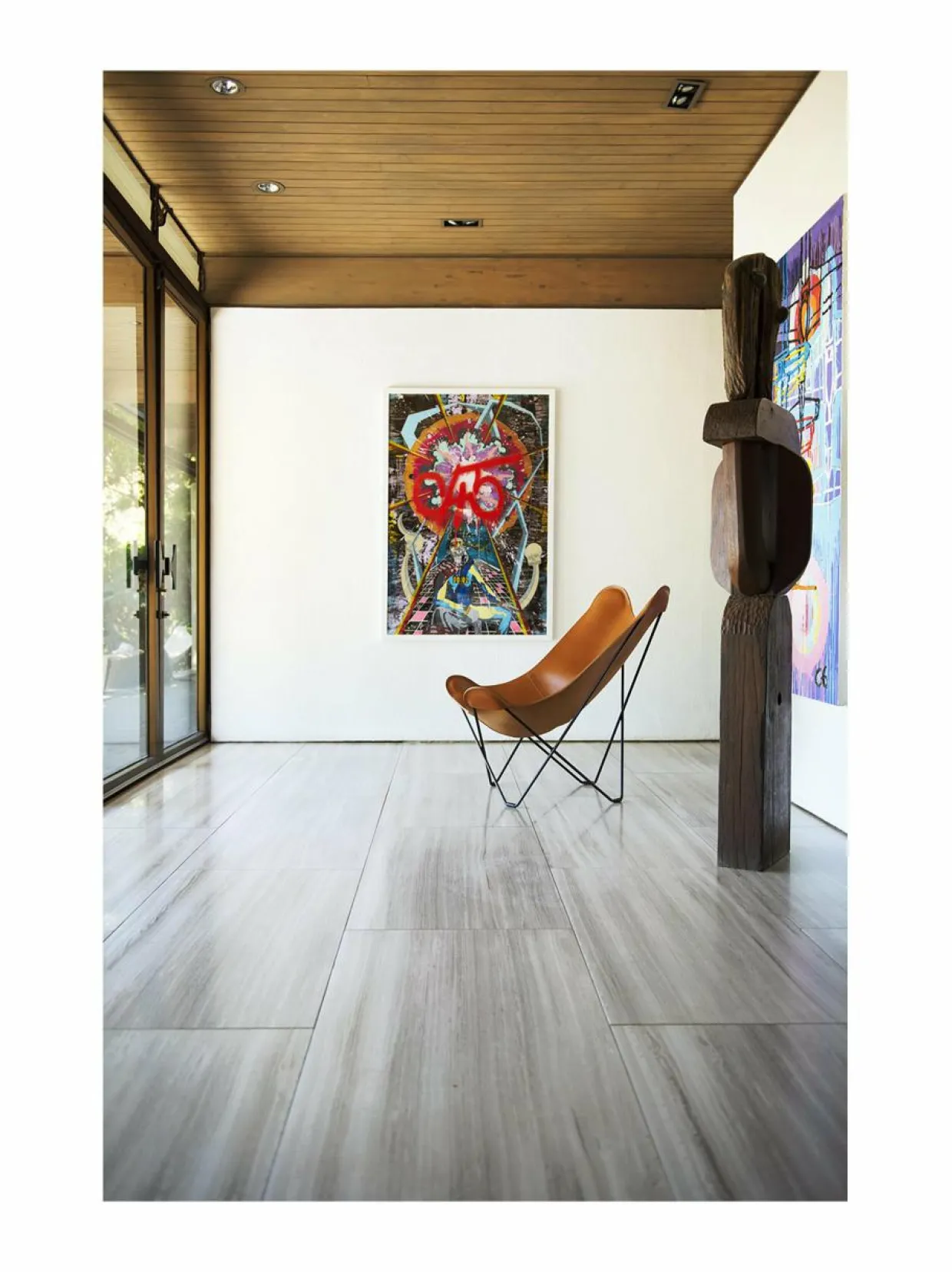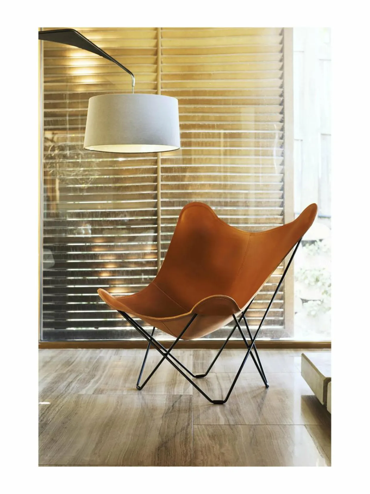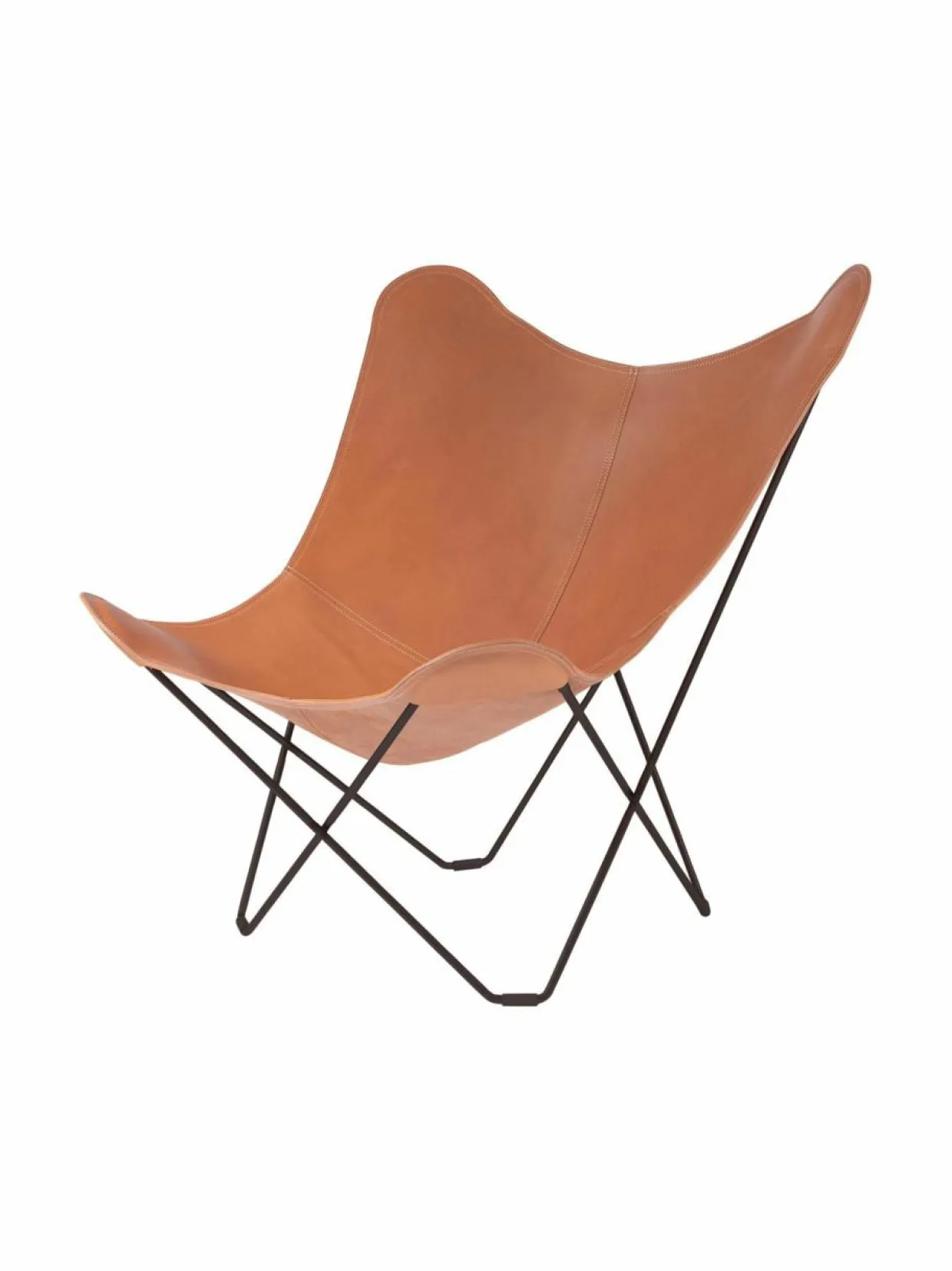 Cueron klassinen Pampa Mariposa -lepakkotuoli henkii 50-luvun muotokieltä. 12 mm vahvaan teräsrunkoon kiinnitettävä verhoilu on kasviparkittua italialaista satulanahkaa. Mukana tulevat lattiasuojat.