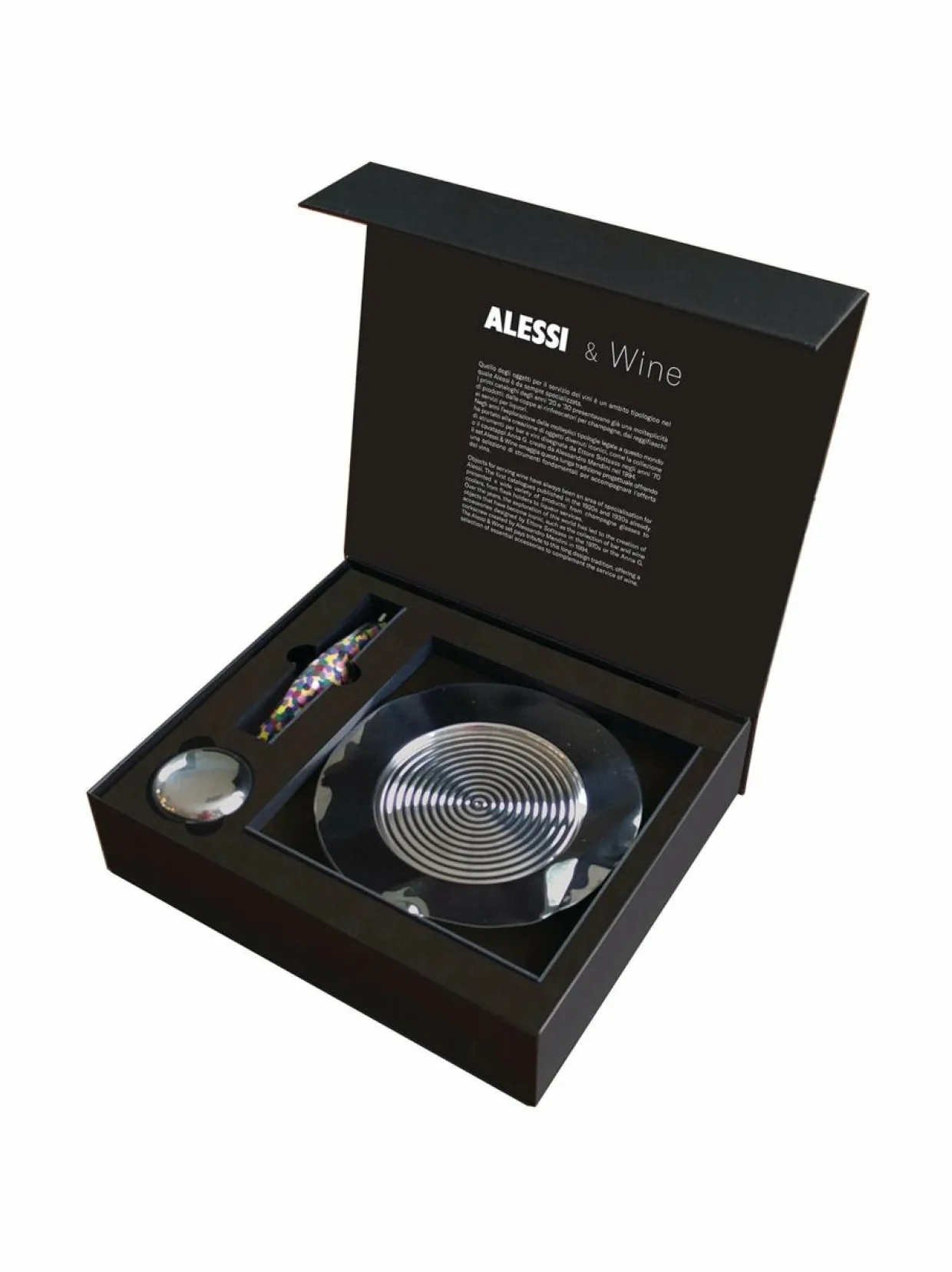 Tuotenumero165019800 MateriaaliAlumiinia ja ruostumatonta terästä ValmistusmaaItalia VäriSTEEL KokoOne size Avainsanatalessi, viinisetti, lahjasetti, viinitarvikkeet, lahjapakkaus
