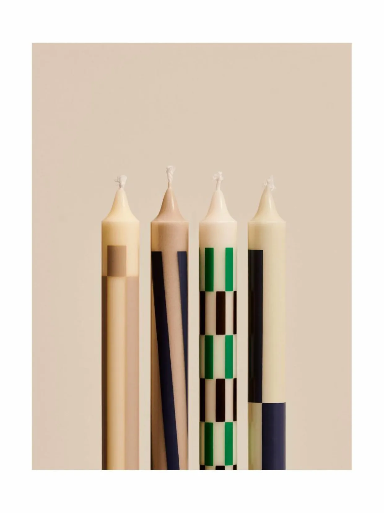 4 kappaleen pakkaus Hayn Pattern-kynttilöitä, jotka tuovat modernin twistin perinteisiin kynttilöihin. Kynttilät on koristeltu erilaisilla geometrisillä kuvioilla ja niissä on toisiinsa sopivat värisävyt. Niiden korkeus on 24 cm ja leveys 2,2 cm. Paloaika on 9 h.