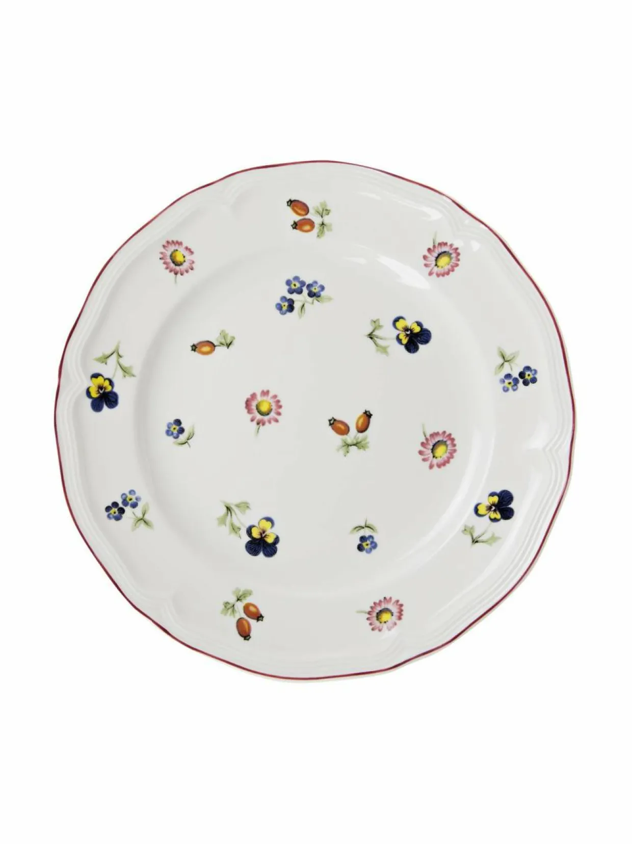 Kauniin kukkaisen Petite Fleur -sarjan astiat on valmistettu lasitetusta posliinista. Lautasessa on kohotettu reuna raidallisella ääriviivalla sekä eri kukkien kuviot.