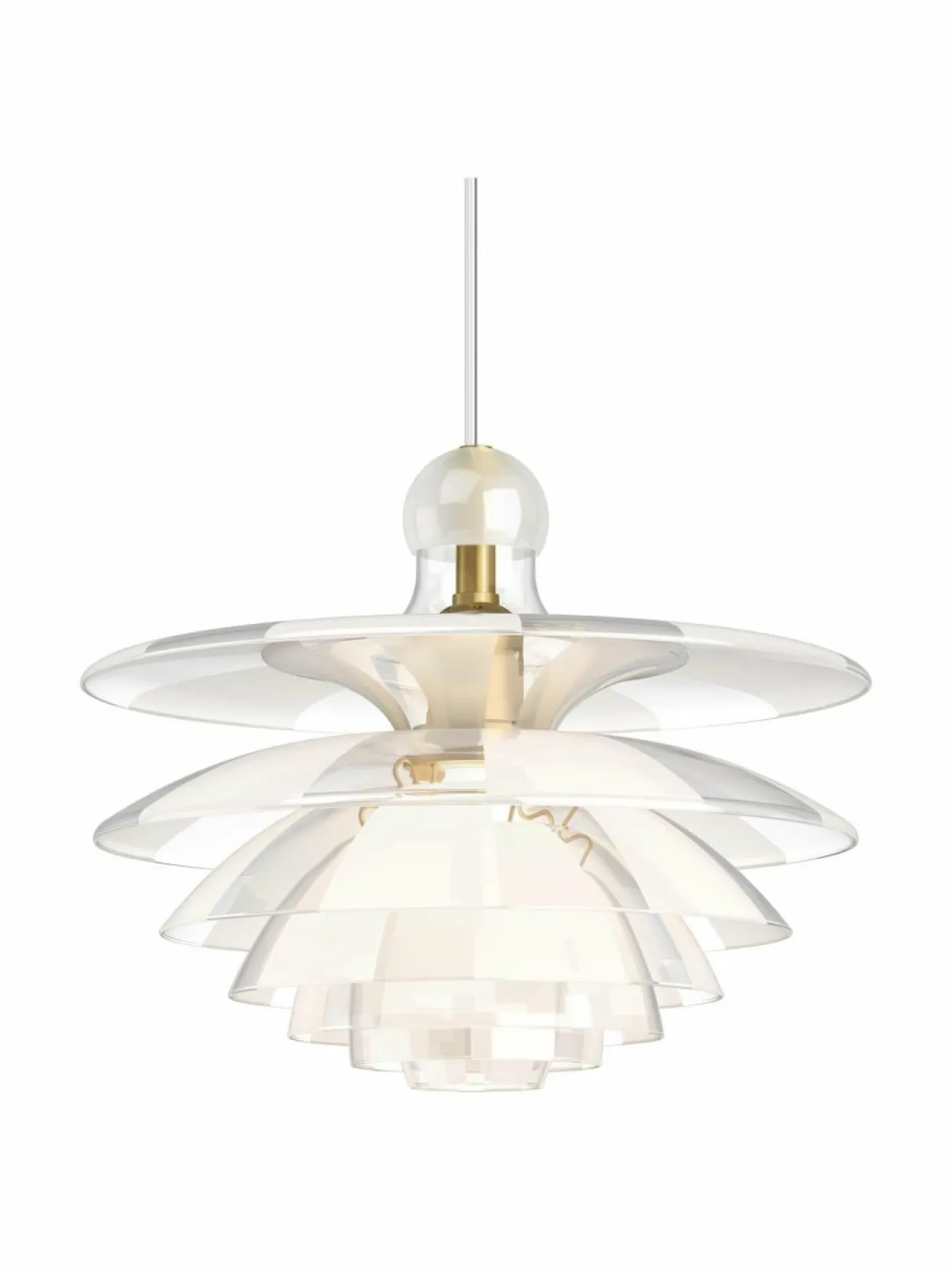 Valaisin koostuu seitsemästä varjostimesta, jotka on valmistettu erittäin herkästä, mutta kestävästä italialaisesta borosilikaattilasista. Varjostimista näkyy vuorotellen kirkkaita ja himmeitä osioita. Ne on sijoitettu niin, että himmeät osiot peittävät niiden alapuolella olevat kirkkaat osiot, jolloin limittäiset kerrokset levittävät valoa hajautetummin, mutta valaisevat edelleen alaspäin häikäisemättä. Yläosan pyöreä lasikuppi estää pölyä pääsemästä valaisimen sisäpuolelle.Tuotenumero150211943 MateriaaliVarjostimet kirkasta lasia hiekkapuhallettuilla osioilla; varjostinten pidikkeet messinkimetalloitua terästä; lampunpitimen kotelo ja kattokuppi satiinikiillotettua messinkiä Pituus500 mm Leveys500 mm Korkeus405 mm Johdon pituus3 m SuunnittelijaPoul Henningsen Valonlähde1 x 28 W KantaE27 VäriCLEAR GLASS WITH SANDBLASTED FIELDS Koko500 x 405 mm