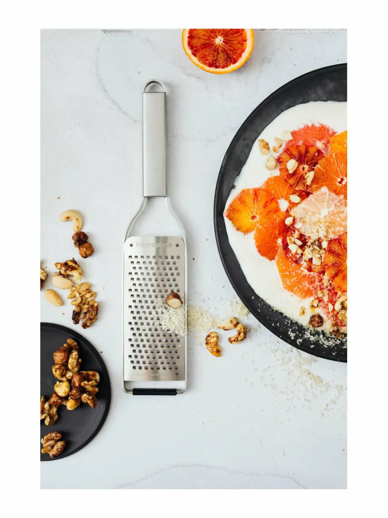 Microplanen Professional Zester -raastin on monipuolinen ja tehokas työkalu, joka on suunniteltu karkeaan raastamiseen. Tämä 32 cm pitkä raastin on ihanteellinen valinta, kun haluat raastaa juustoa, kookosta, valkosipulia, inkivääriä tai pähkinöitä suuremmiksi, mutta silti tasaisiksi lastuiksi. Raastimen terä on valmistettu ruostumattomasta teräksestä.