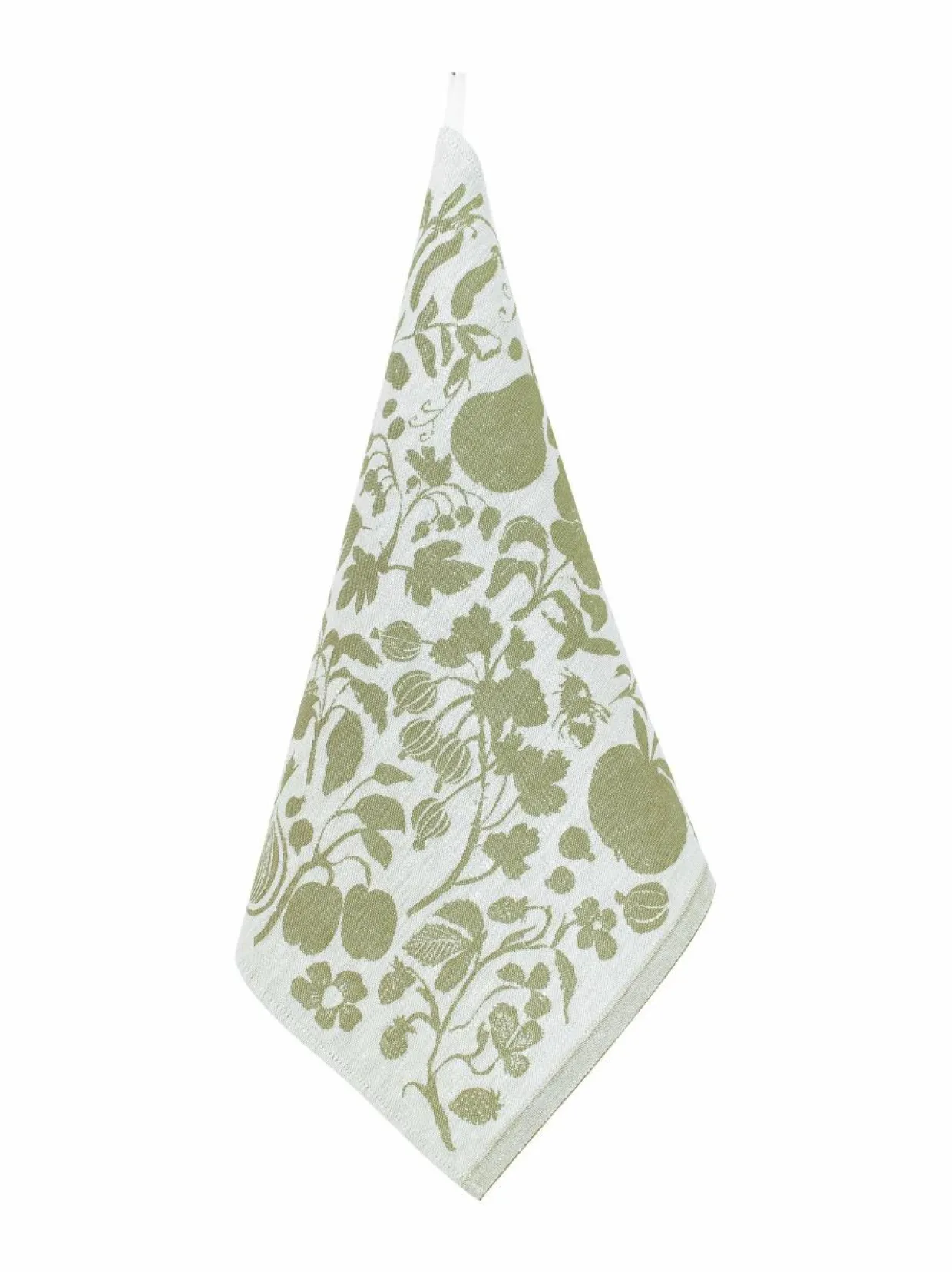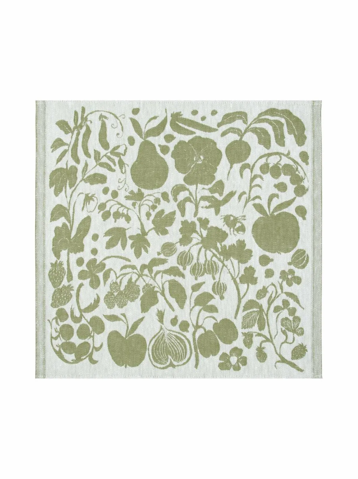 Puutarha-kuosin on suunnitellut Saara Obele. Kuosi on yhtä runsas kuin taitavan puutarhurin pöydän antimet. Mikään ei maistu yhtä hyvältä kuin omassa maassa lempeällä huolenpidolla kasvanut ruoka, joka nautitaan yhdessä, lähimpien ympäröimänä elonkorjuun aikaan. Puutarha-pyyhe sopii hyvin myös servietiksi tai pieneksi liinaksi. Tuotteessa on ripustin yhdessä kulmassa. Tuote on valmistettu pellavasta ja bio-orgaanisesta puuvillasta.