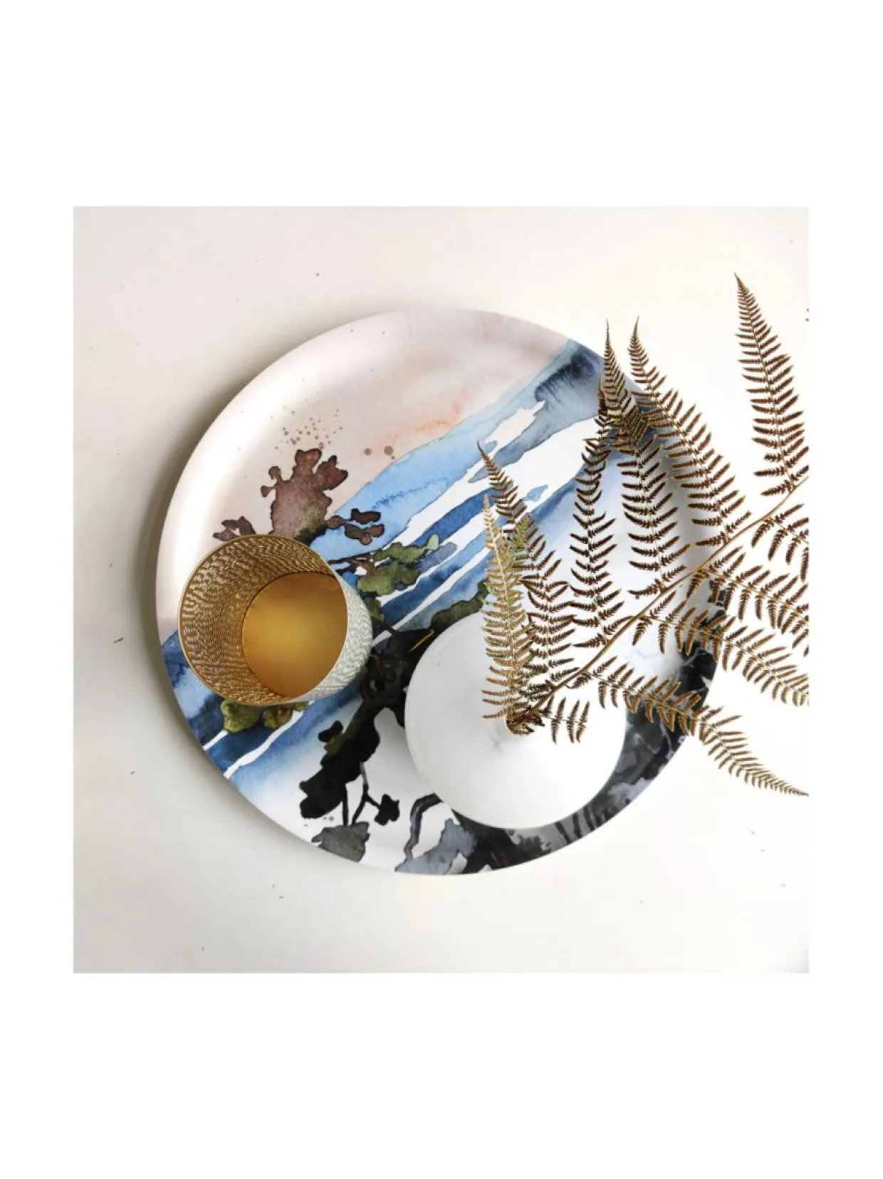 Tarjotin on monipuolinen kattauksen ja muun sisustuksen käyttötavara. Tämä pyöreä tarjotin juuri sopiva kakkujen tarjoilulautaseksi. Maalauksellinen tarjotin on ihana sisustusesine myös sohvapöydälle.