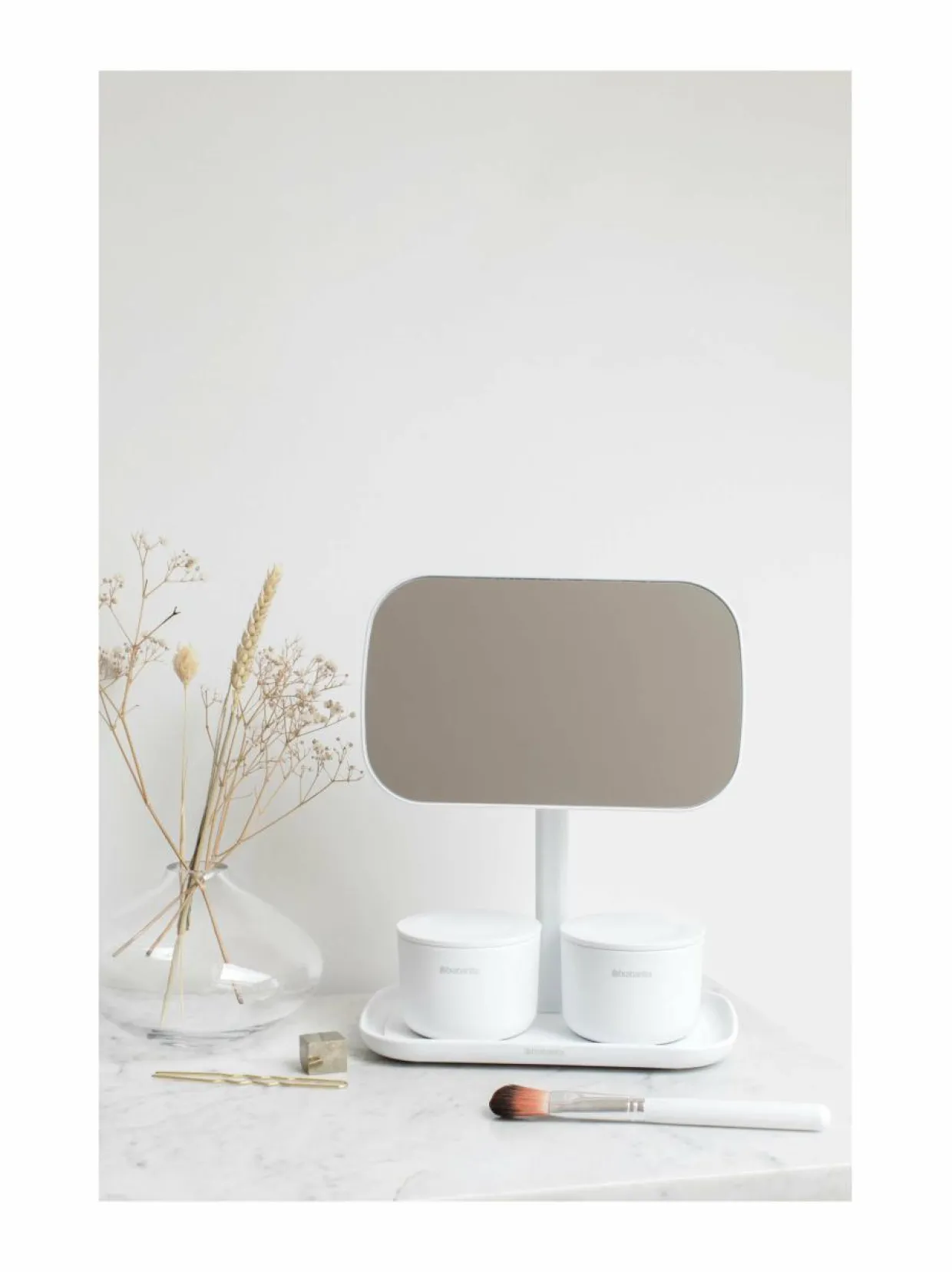 Brabantia ReNew -peili on minimalistinen pöytäpeili, jonka jalustassa on käytännöllinen tarjotin. Peiliä voi kääntää aina sopivaan asentoon helposti, sekä korkeudeltaan että sivuille. Jalustassa on pieni tarjotin, jossa silikoninen alusta. Myös pohjassa liukueste. 5 vuoden takuu.