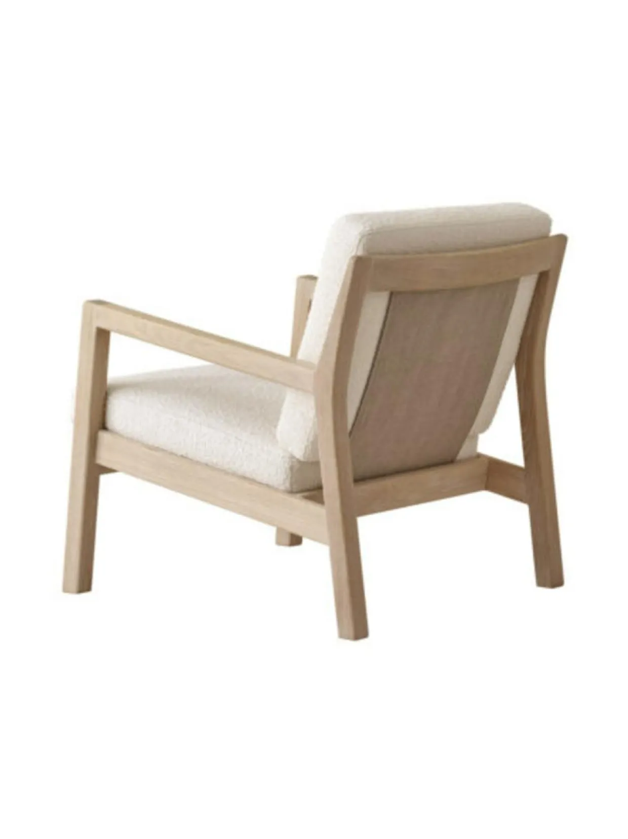 Tämä tammirunkoinen Rialto nojatuoli on verhoiltu luonnonvalkoisella villasekoitekankaalla ja siinä on katseenvangitsijana upea pellavaselkä.