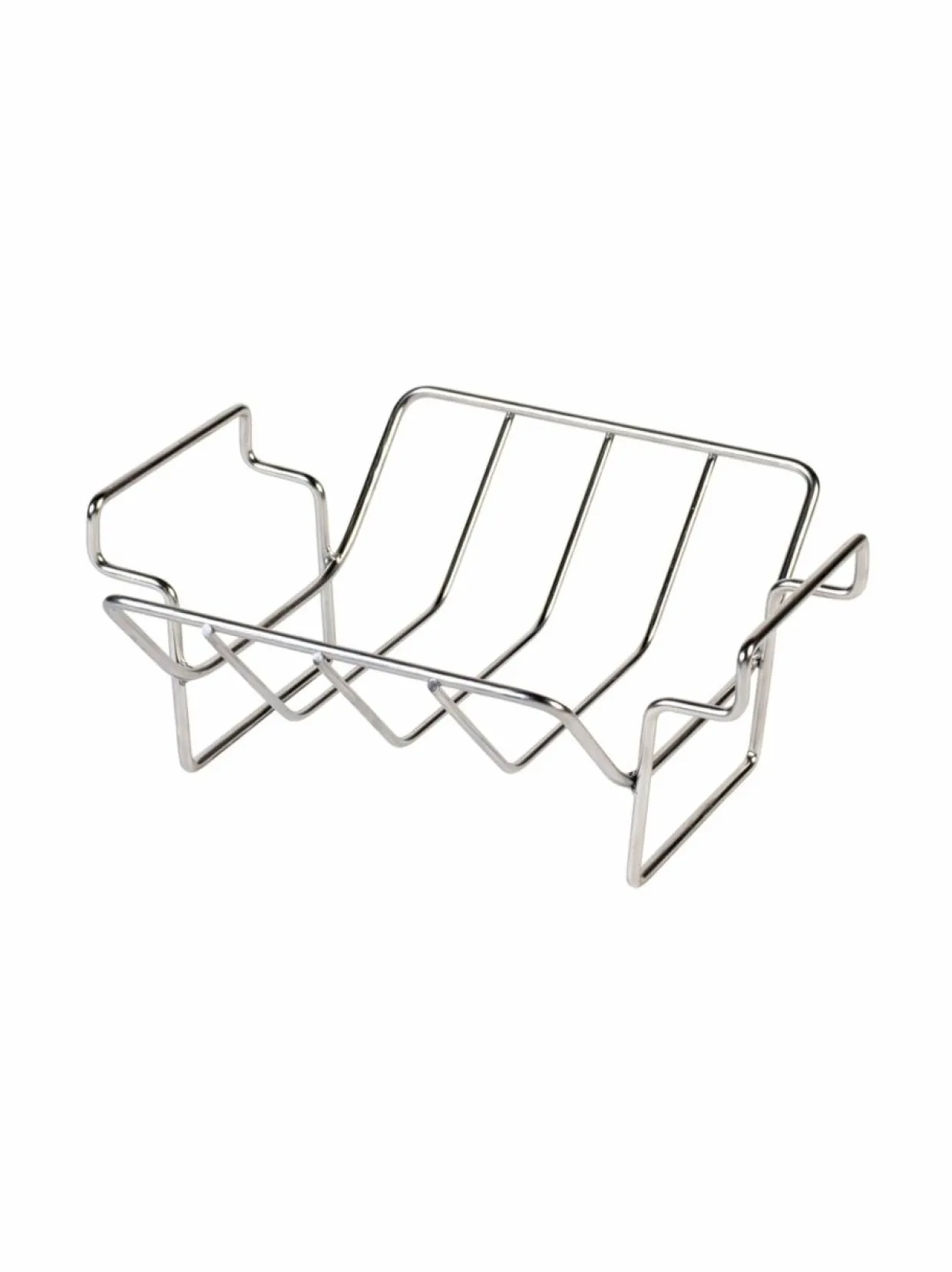 Monikäyttöinen Ribs and Roasting Rack on ihanteellinen lihan paistamiseen. Pystyasennossa se on V-teline: sopii suurten lihapalojen tai (täytettyjen) lintujen hitaaseen kypsennykseen. Jos käännät telineen, se on ihanteellinen ribsien kypsennykseen. Jatkuva ilmavirta telineen ympärillä saa aikaan mahtavan lopputuloksen. Ehdottoman välttämätön lihansyöjille.Telinettä voi myös käyttää lepoalustana entistä mehukkaamman lihan saamista varten. Vinkki: käytä telinettä yhdessä suorakulmaisen valutusvuoan kanssa. Paistorasva valuu siihen ja saat heti pohjan herkulliselle kastikkeelle. V-telineeseen mahtuu enintään noin 5 kilon paisti.