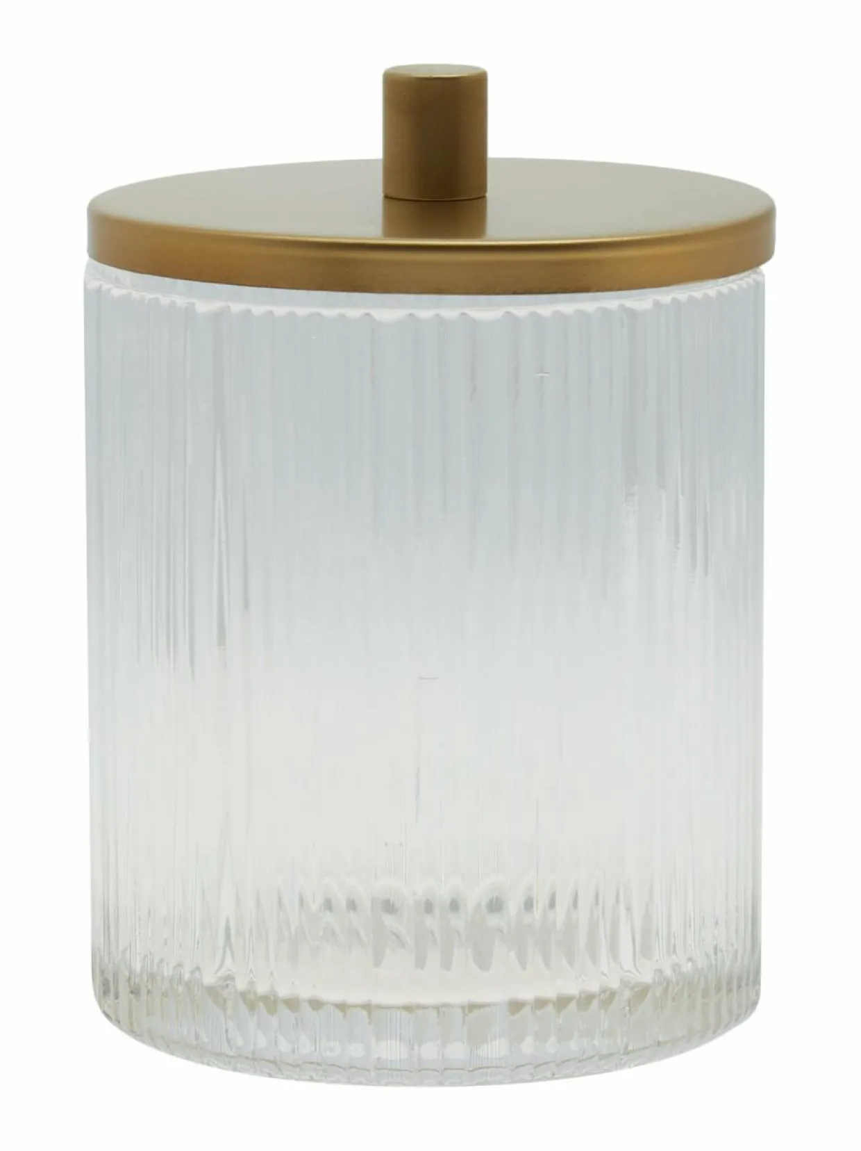 Tuotenumero170144382 MateriaaliLasi, metalli ValmistusmaaKiina VäriCLEAR GLASS/MATT GOLDEN Koko9,8 x 13,6 x 9,8 cm AvainsanatVilla Stockmann, lasinen vanurasia, kylpyhuone rasia, kylpyhuoneen sisustus, lasirasia, lasipurkki, vanupurkki, purkki, kannellinen, lastiastia, hammasharjamuki, lasimuki
