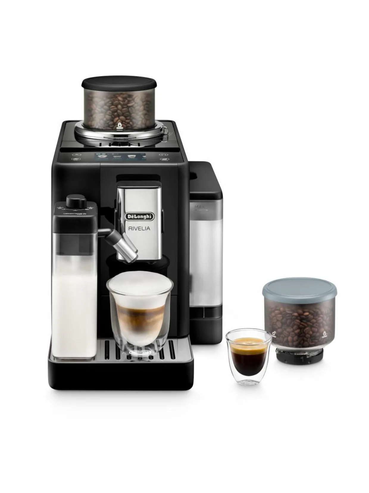 De’Longhi Rivelia – uusinta teknologiaa pienessä koossa!Johtavan kahvilaitevalmistajan kooltaan kompaktiksi muotoiltu kahviautomaatti tarjoaa käyttöösi 16 suoravalintaista kahvireseptiä, kaksi helposti vaihdettavaa papusäiliötä, värilliseltä hipaisunäytöltä hallittavan Bean Adapt -teknologian ja täydellisen maitokahvisi viimeistelevän LatteCrema Hot -maidonkäsittelyteknlogian.Käyttäjäystävällinen kahvikonei on helppo ottaa käyttöön värillisen hipaisunäytön neuvojen ja animaatioiden ystävällisellä opastuksella. Neljän nimettävän käyttäjäprofiilin taakse jokaisen käyttäjän on helppo muokata omat lempikahvinsa omia mieltymyksiään vastaavaksi MY-toiminnon avulla. Sukella Rivelian värillisen hipaisunäytön maailmaan ja pyyhkäise laajan reseptivalikoiman läpi.