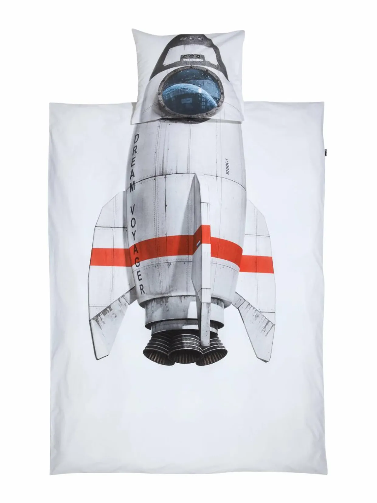 Snurk-pussilakanasettiä koristaa raketti, jonka matkassa voi unissaan singahtaa suoraan tähtiin. Settiin kuuluu pussilakana sekä tyynyliina. Petivaatteet on valmistettu pehmeästä luomupuuvillasta.
