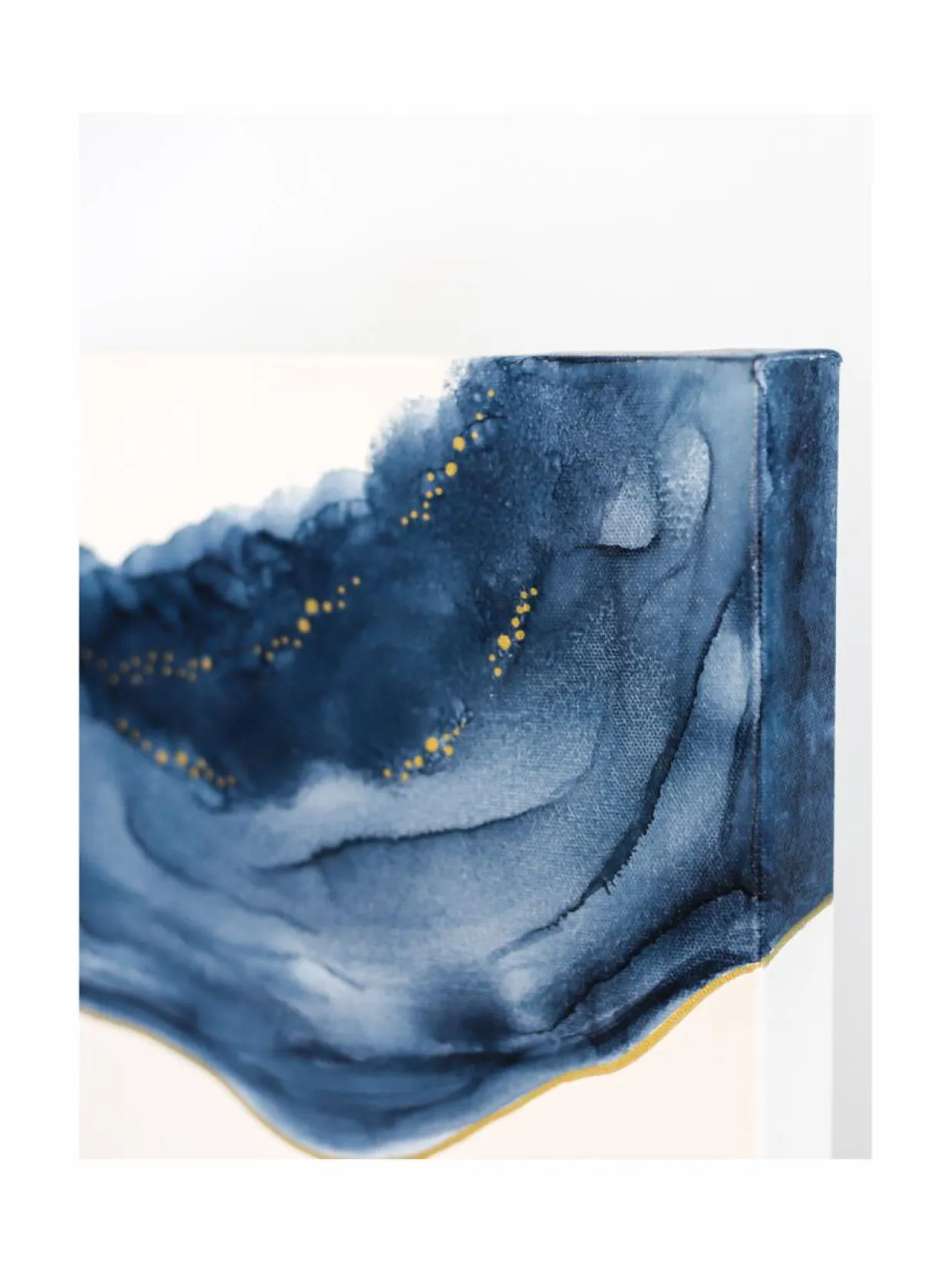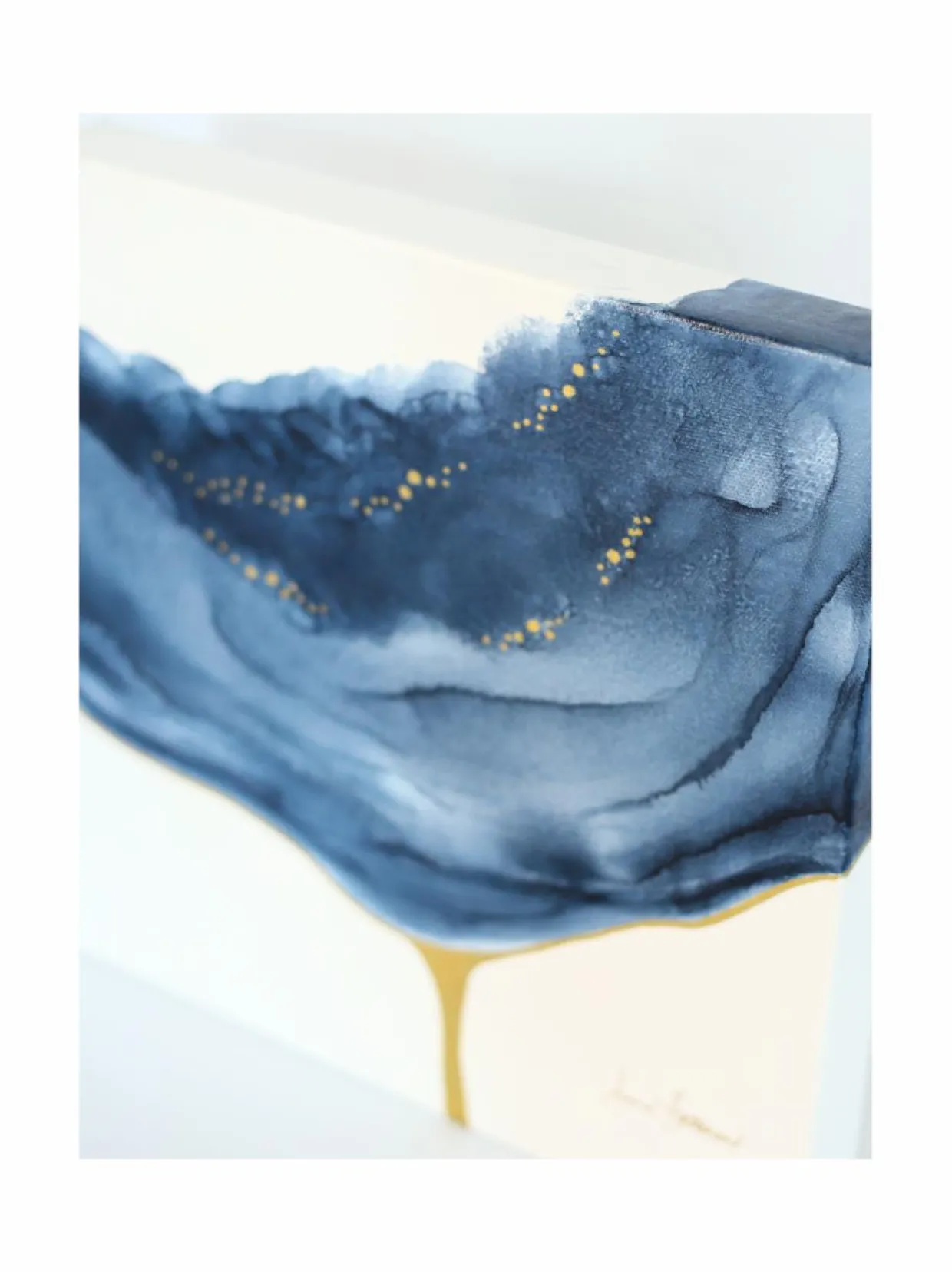 Abstrakti FREESIA-kukka on saanut inspiraationsa pohjoisen luonnosta. Taideteos on toteutettu sinistä alkoholimustetta puhaltamalla. Raikas ilme on viimeistelty kullansävyisillä yksityiskohdilla.
