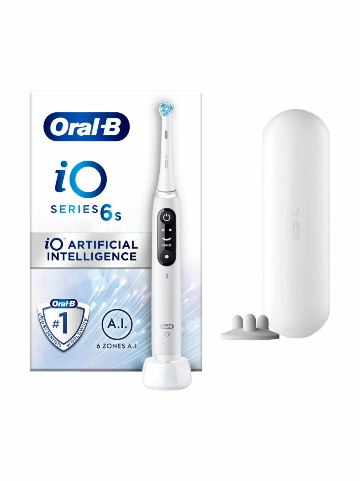 Oral-B sähköhammasharja iO 6S, jonka ainutlaatuisen pyöreän harjaspään hellävarainen mikrovärähtely antaa ammattimaisen puhtaan tunteen joka päivä.