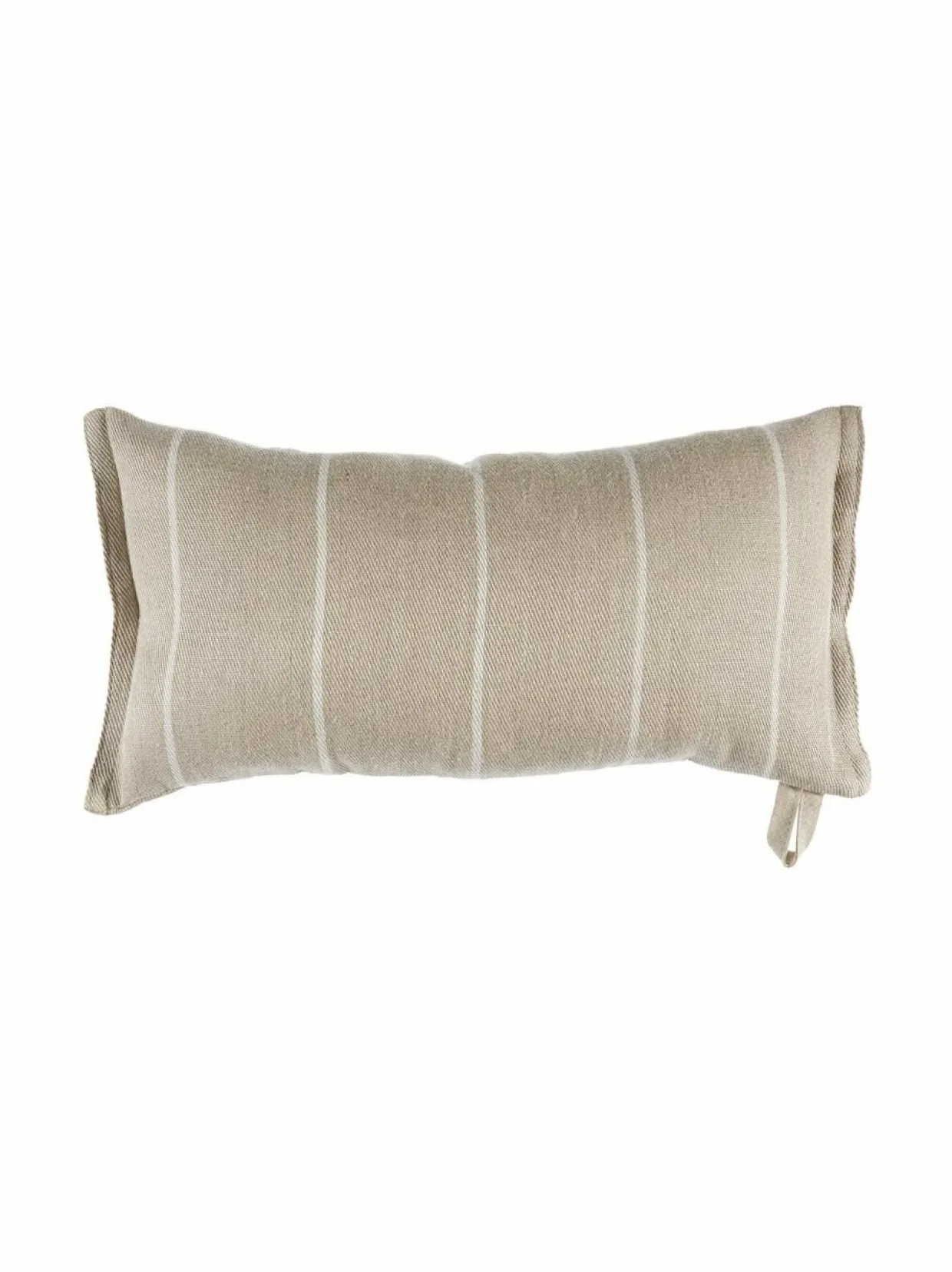 Pehmeän saunatyynyn päällinen on raidallista pellavakangasta, joka kestää hyvin käyttöä ja pesua. Tyynyn sivussa on ripustuslenkki.