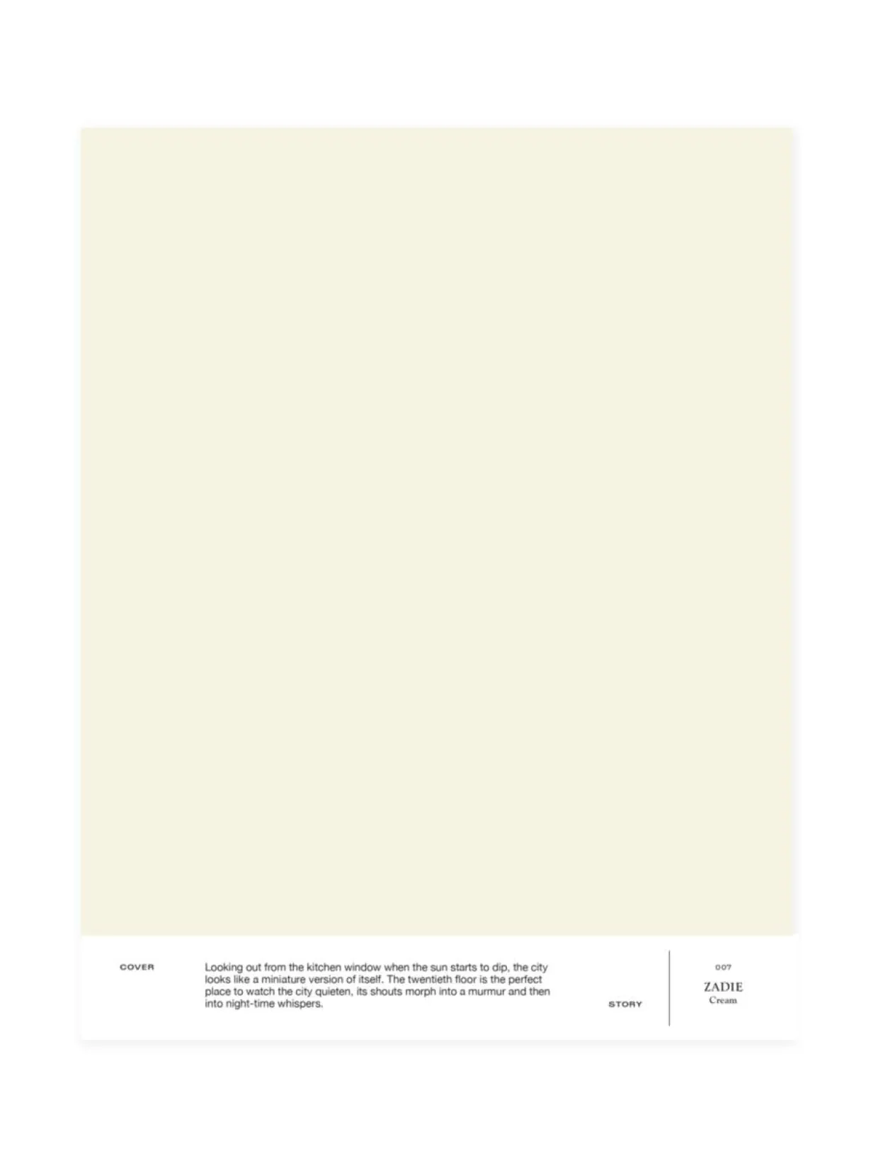 007 ZADIE on klassinen kermanvalkoinen, joka toimii niin modernissa ympäristössä kuin romanttisessa puutalossa. A4-kokoinen ja tarrataustainen värimalli on maalattu aidolla täyshimmeällä Cover Story -maalilla, joten voit olla varma, että sävy on sama kuin varsinaisessa maalissa. Mallitarran voi liimata helposti suoraan maalattavalle pinnalle ja katsoa, miltä sävy näyttää erilaisissa valaistuksissa, sillä valon laatu ja määrä vaikuttavat merkittävästi siihen, miten havaitsemme värin.
