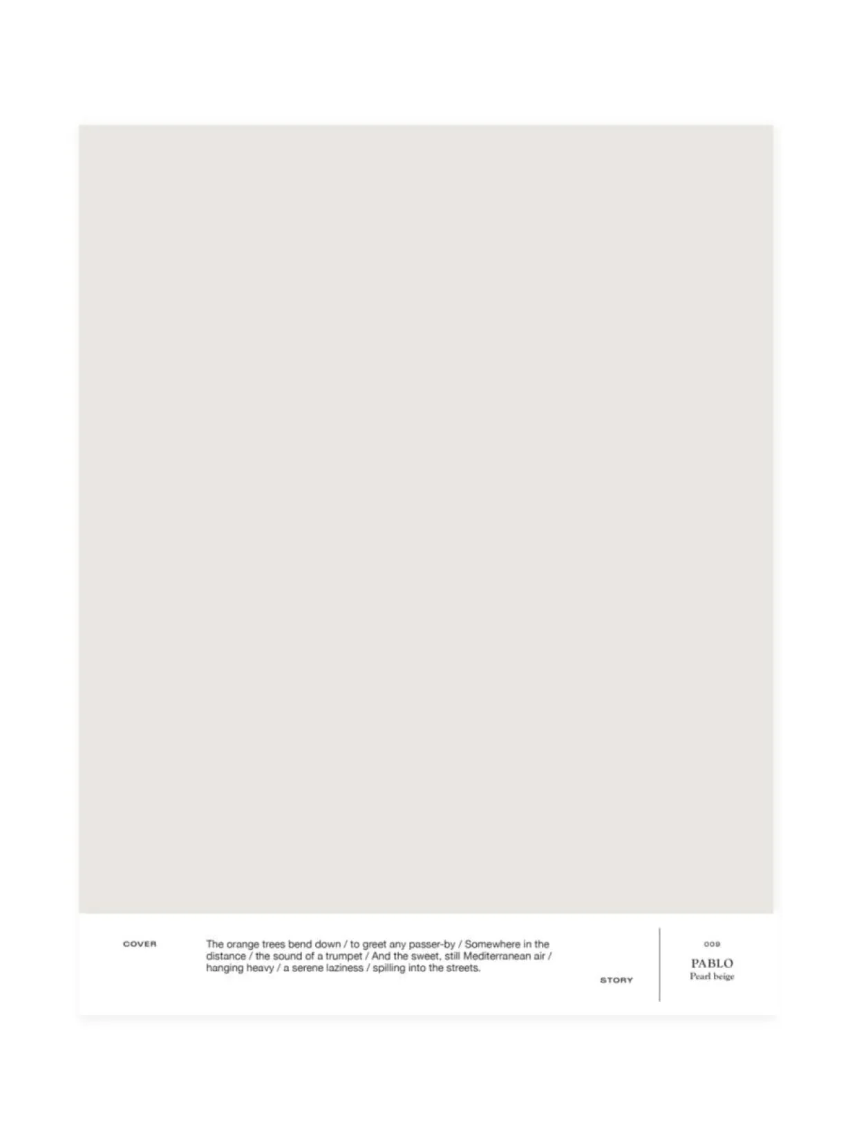 009 PABLO on kylmään roosaan taittuva helmimäinen harmaa. A4-kokoinen ja tarrataustainen värimalli on maalattu aidolla täyshimmeällä Cover Story -maalilla, joten voit olla varma, että sävy on sama kuin varsinaisessa maalissa. Mallitarran voi liimata helposti suoraan maalattavalle pinnalle ja katsoa, miltä sävy näyttää erilaisissa valaistuksissa, sillä valon laatu ja määrä vaikuttavat merkittävästi siihen, miten havaitsemme värin.